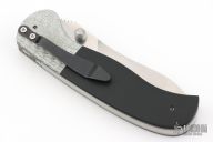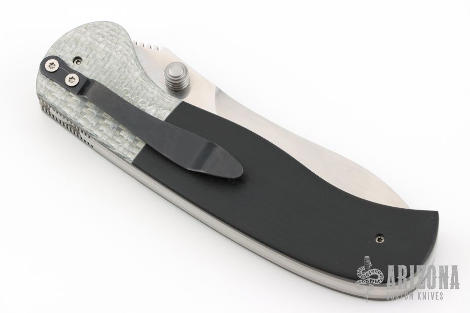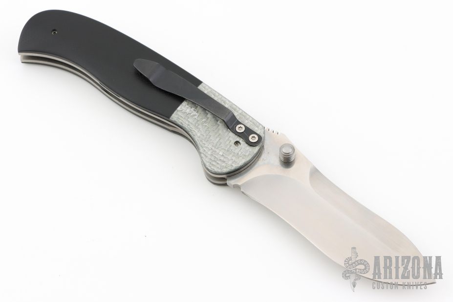 This knife by Andre Van Heerden features a hand rub satin finished blade with dual thumbstud and a fileworked thumbrest. The handle has titanium bolsters, G10 scales, titanium liners, stainless steel backspacer.  Black steel tip down pocket clip. Comes with a zippered case. Has a few scratches on the backspacer otherwise the knife is in excellent condition.