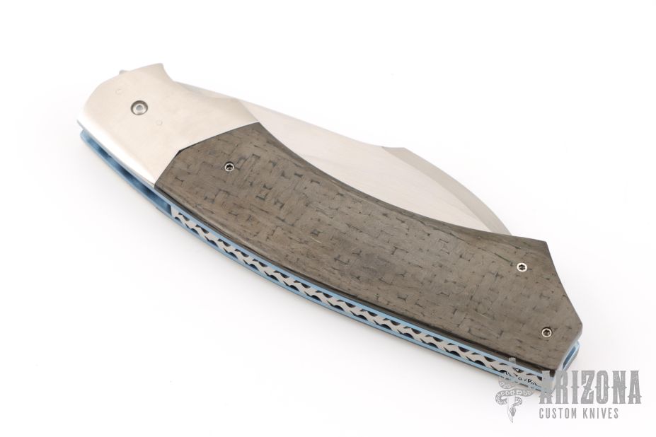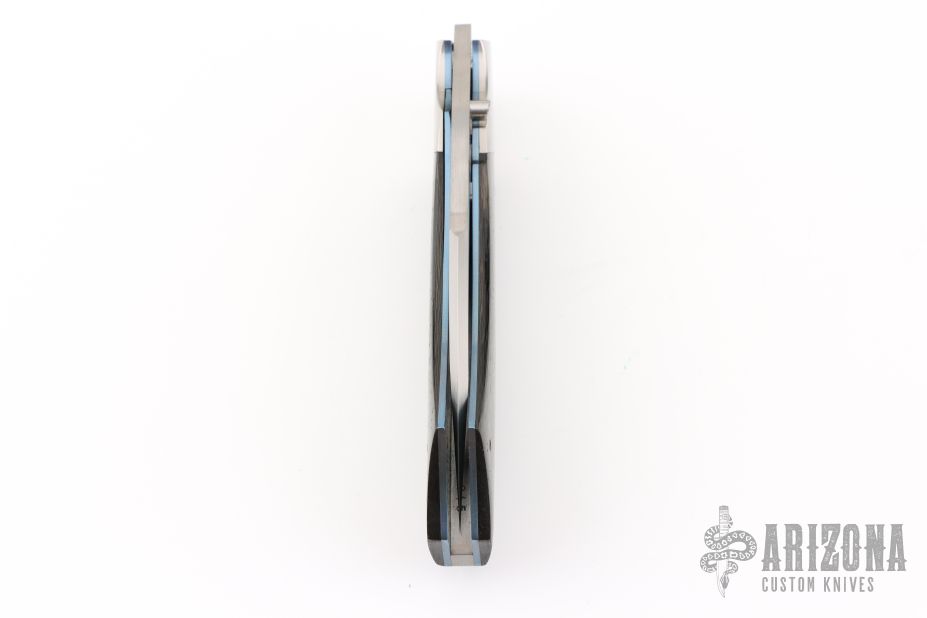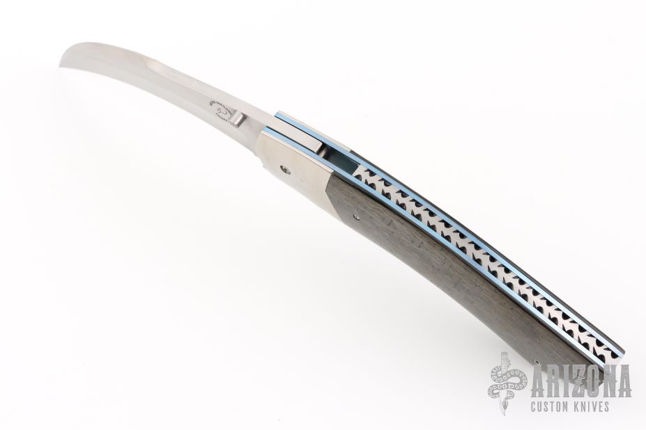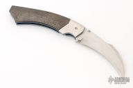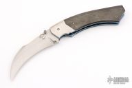 This Wasp by Reese Weiland features a hand rub satin finished hawkbill blade with a single checkered thumbstud. The handle has titanium bolsters, carbon fiber scales, stainless steel backspacer, anodized titanium liners with jeweled interiors. Nice detent and lockup. Has a couple light scratches, otherwise excellent condition. #045