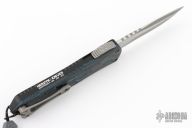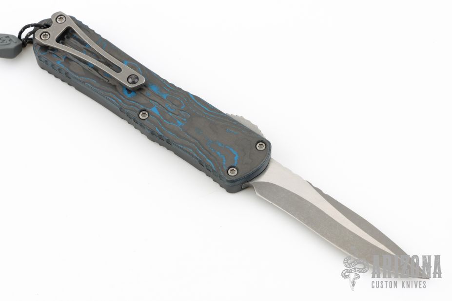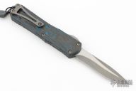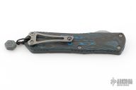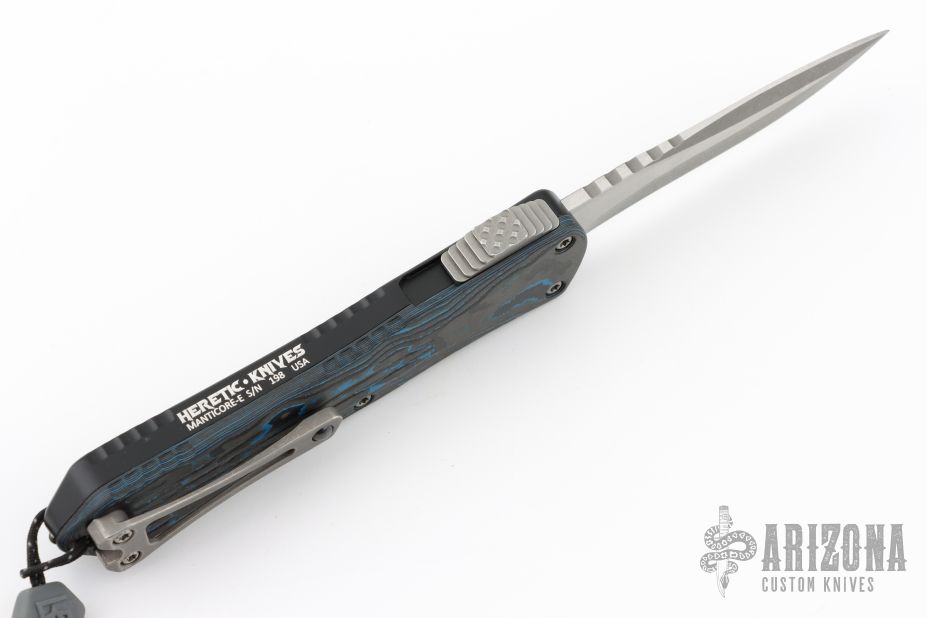This Manticore-E by Heretic Knives features an acid/tumble finished recurve blade with notched thumbrest. The handle has a black aluminum frame, blue carbon fiber top stainless steel hardware and tip down clip. Comes with Heretic drawstring pouch and box. S/N 198. Has some light scratches otherwise good condition.