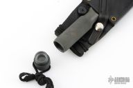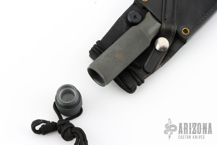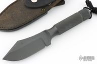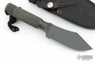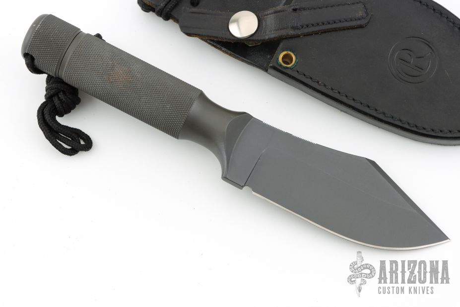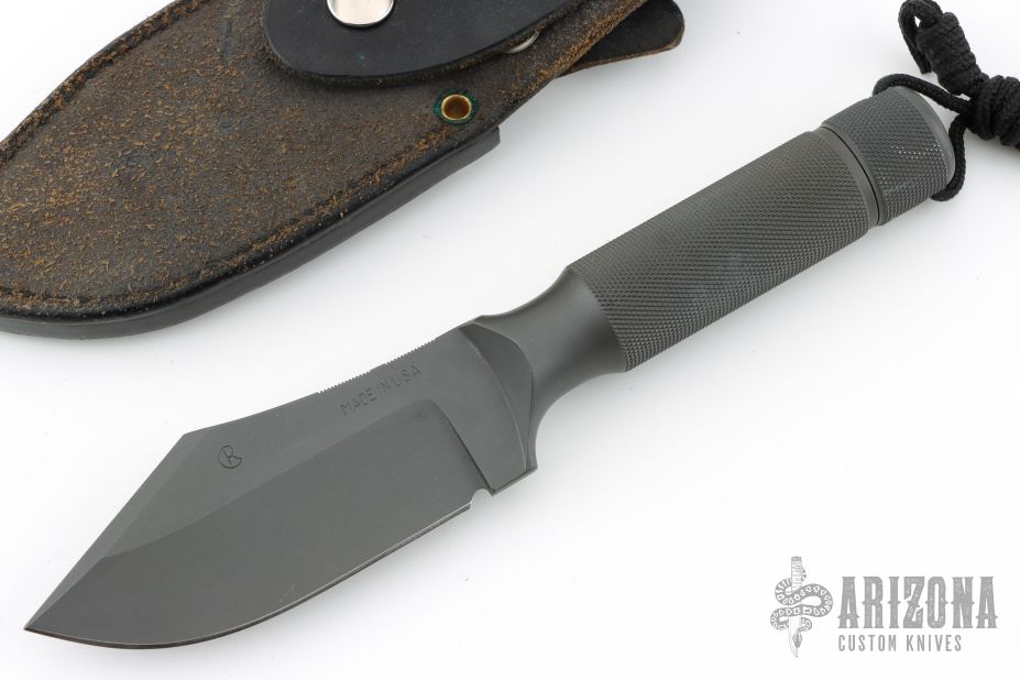 This Ubejane Skinner from Chris Reeve features a non reflective black finish with a clip point A2 blade with a false top edge and notched thumbrest, .204" blade stock and 1.685" blade depth, integral construction. The handle is knurled for a solid grip and has a removable butt cap with lanyard, has butt cap and storage area inside the handle. Comes with original sheath. Has some light scuffs and scratches, great condition otherwise.