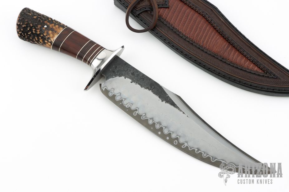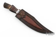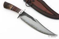 Another absolutely stunning piece from the Sobral brothers! This fighter features a San Mai Damascus blade with top edge, .292" blade stock and 2.135" blade depth, hidden tang construction. The handle has a polished stainless steel guard and a beautiful stag grip with wood, stainless, and micarta spacers. This piece comes in an equally impressive, hand tooled, brown leather sheath. Has some patina on the blade. Excellent condition.