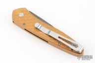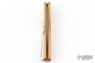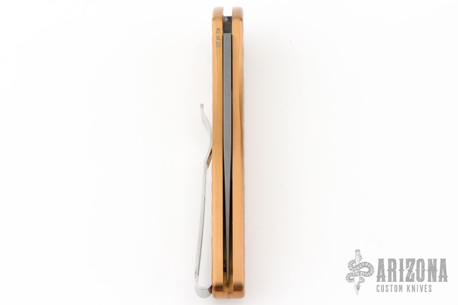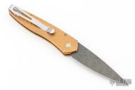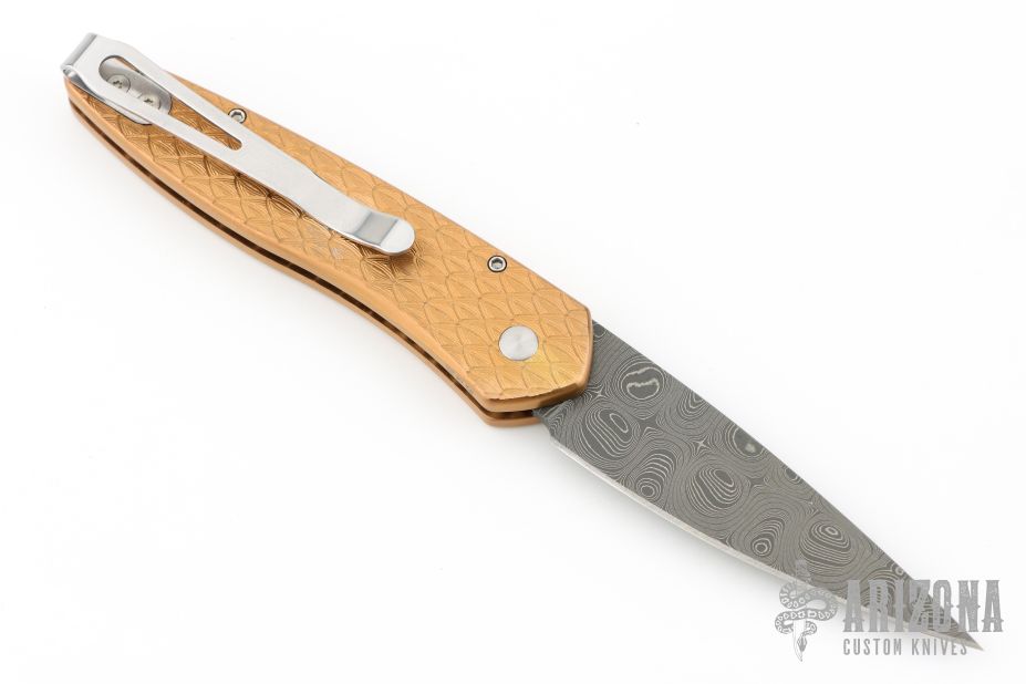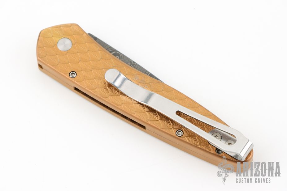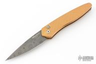 This Newport Custom by Pro-Tech Knives features a Damascus blade. The handle has a feather pattern copper frame with black lip pearl inlaid push button, milled and steel tip up clip. Includes the original box. Excellent condition.