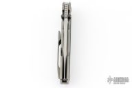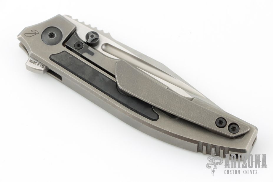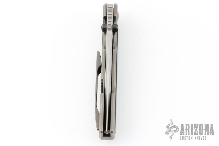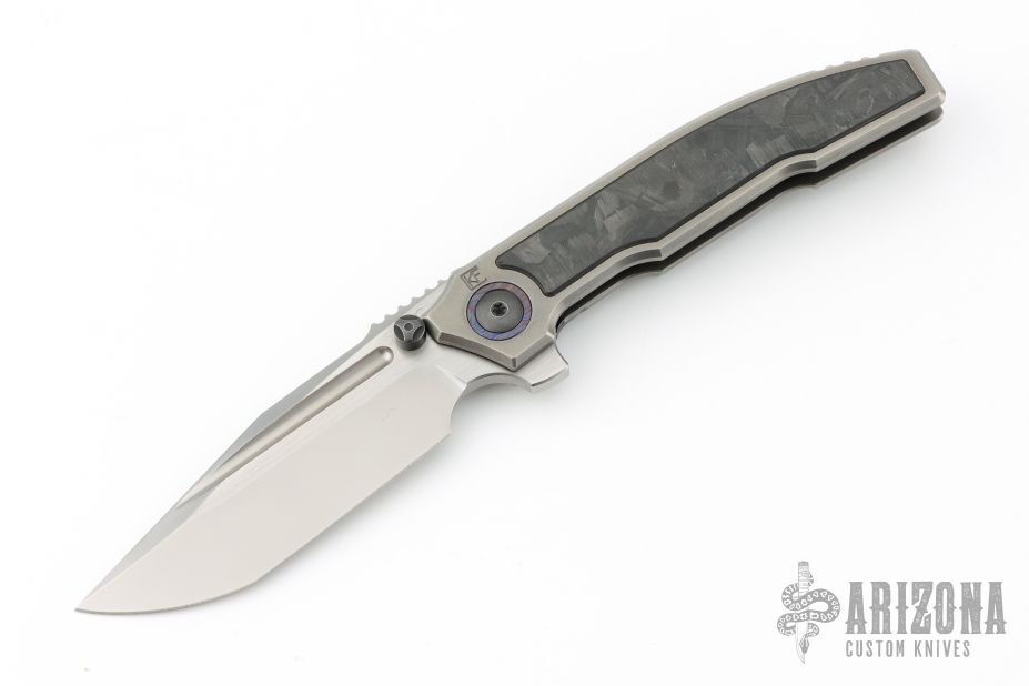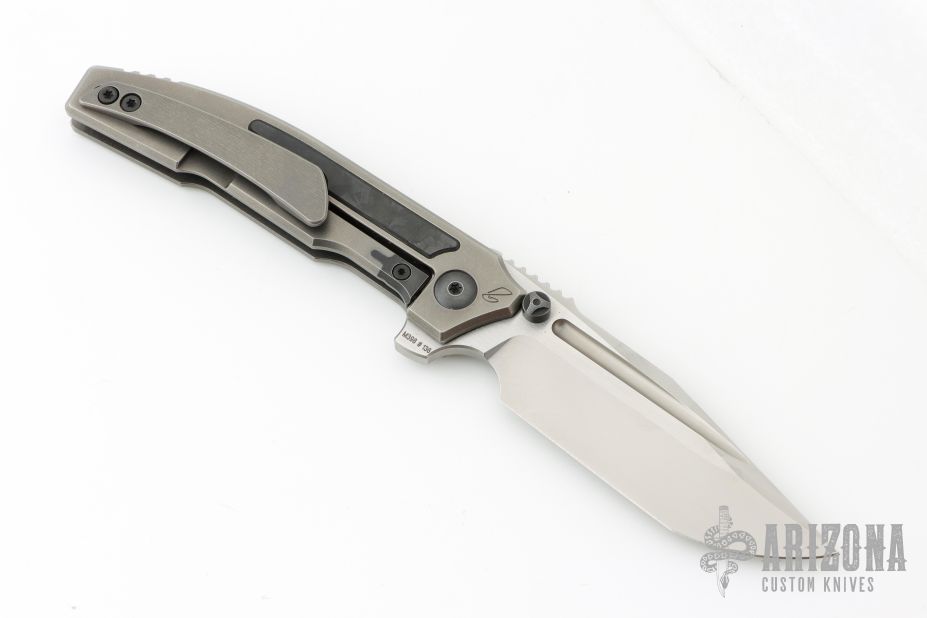 This Snafu 2024 Integral Flipper by Custom Knife Factory is a Peter Rassenti design, it features a two tone blade with notched thumbrest and flipper. The handle has a tumble finished titanium frame and tip up clip, ZircuTi pivot collars, carbon fiber inlays. Rides on bearings, nice detent, lockup and blade seating. Has a stainless lockface insert. Comes with zippered case and COA dated 12-24, #136. Excellent condition.