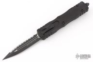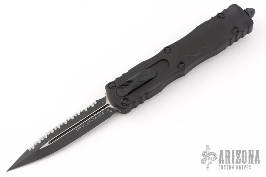 This Dirac Delta OTF automatic by Microtech features a D/E DLC finished blade with a fully serrated edge. The handle is DLC aluminum with a stainless steel tip down clip. Serial number 5365 and dated 02/2022. Has a couple light scuffs and scratches, great condition otherwise.