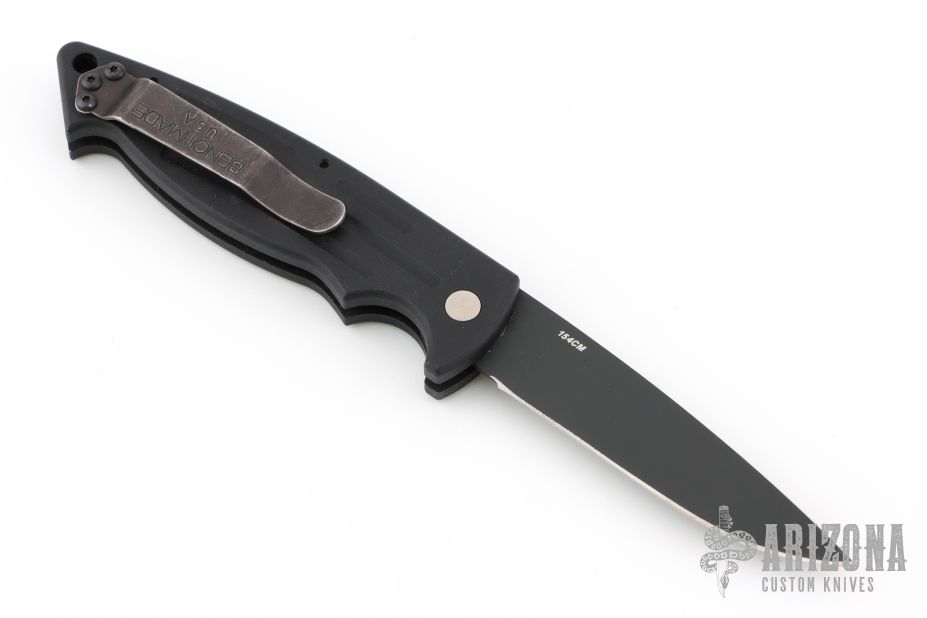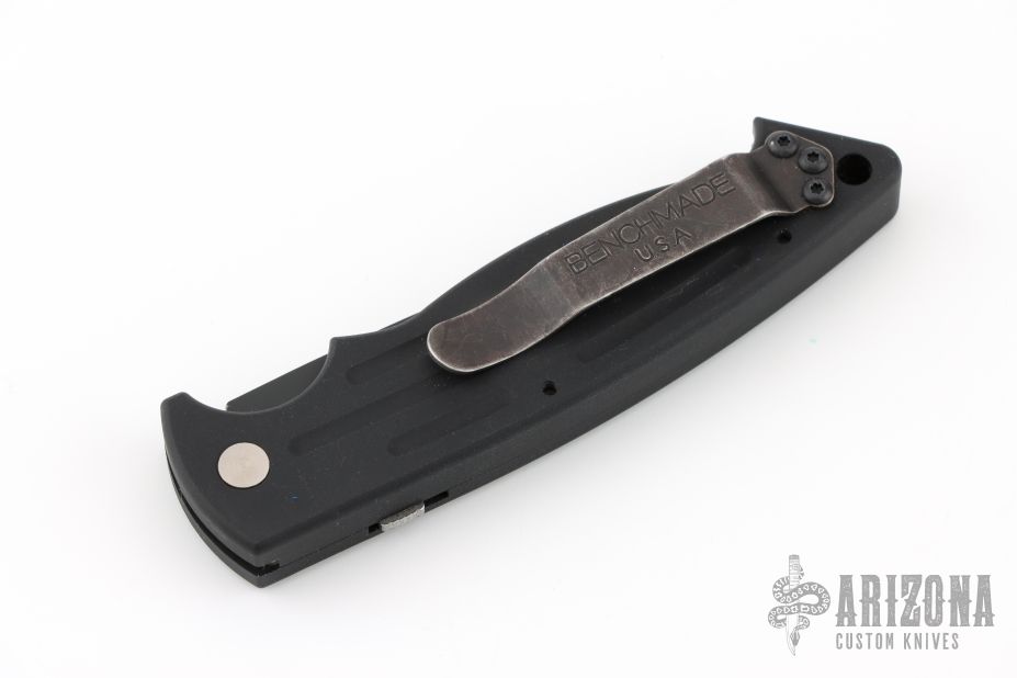 This Reflex Auto by Benchmade features a black drop point blade and a black aluminum handle with black stainless steel tip up clip, lanyard hole at the butt and safety on the spine. Has a couple light scuffs and scratches, great condition otherwise.