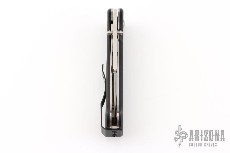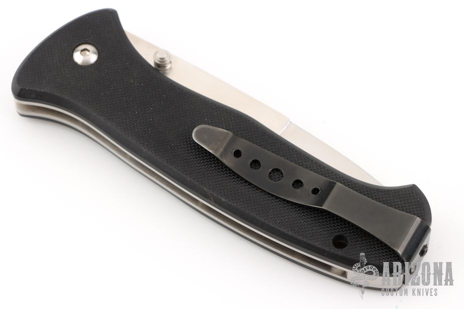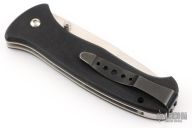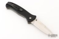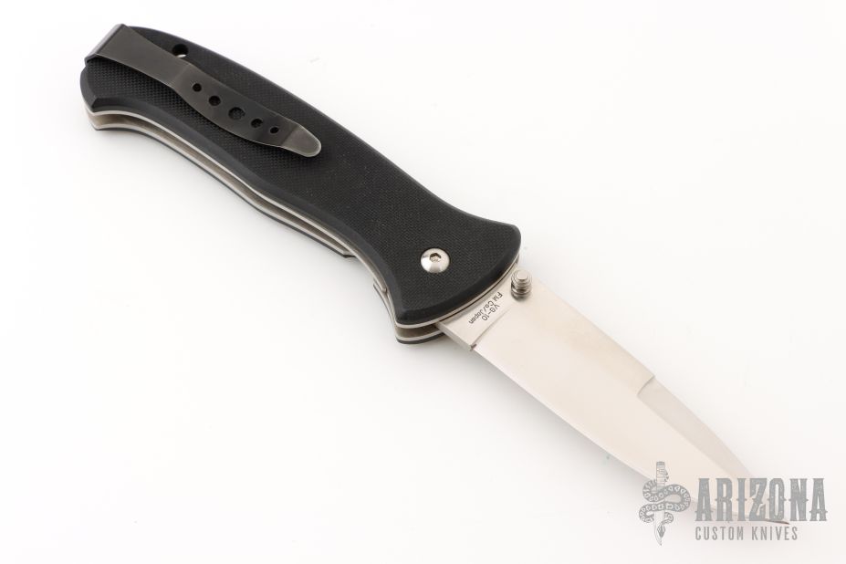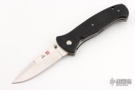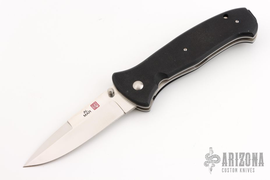 This SERE 2000 Linerlock Folder from Al Mar Knives has a satin finished VG-10 stainless steel drop/ spear point blade with dual thumb studs. Handle is black G10 over stainless steel liners, black stainless steel tip up clip, and lanyard hole. Has a couple light scuffs and scratches, excellent condition otherwise.