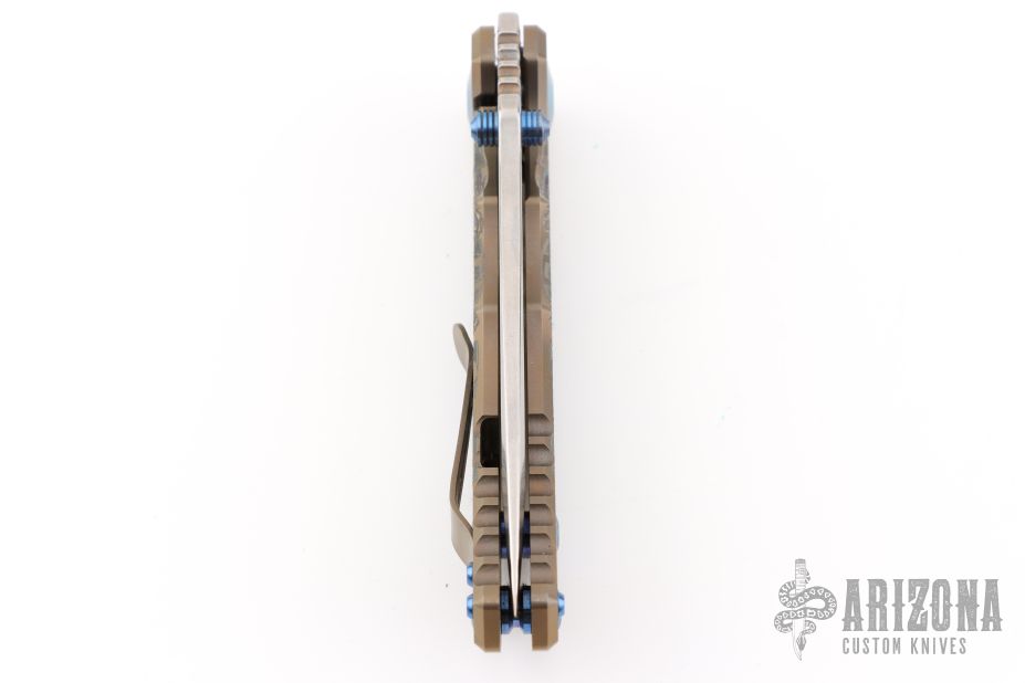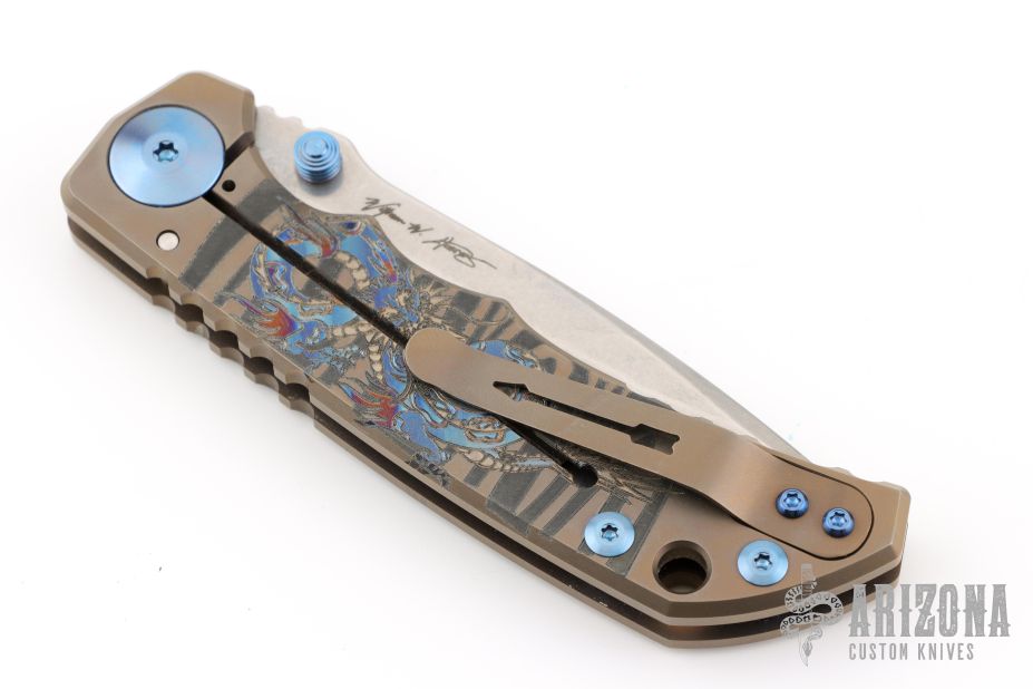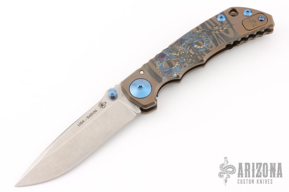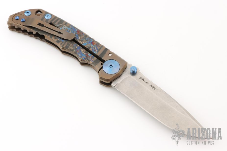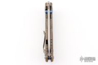 This Harsey framelock folder by Spartan Blades features a stonewash finished drop point blade with dual thumbstuds and a notched thumbrest. The handle has an anodized titanium frame with a laser engraving a tip up titanium clip and filler tab. Has nice detent, lockup, and blade seating. Has a couple light scuffs, excellent condition otherwise.