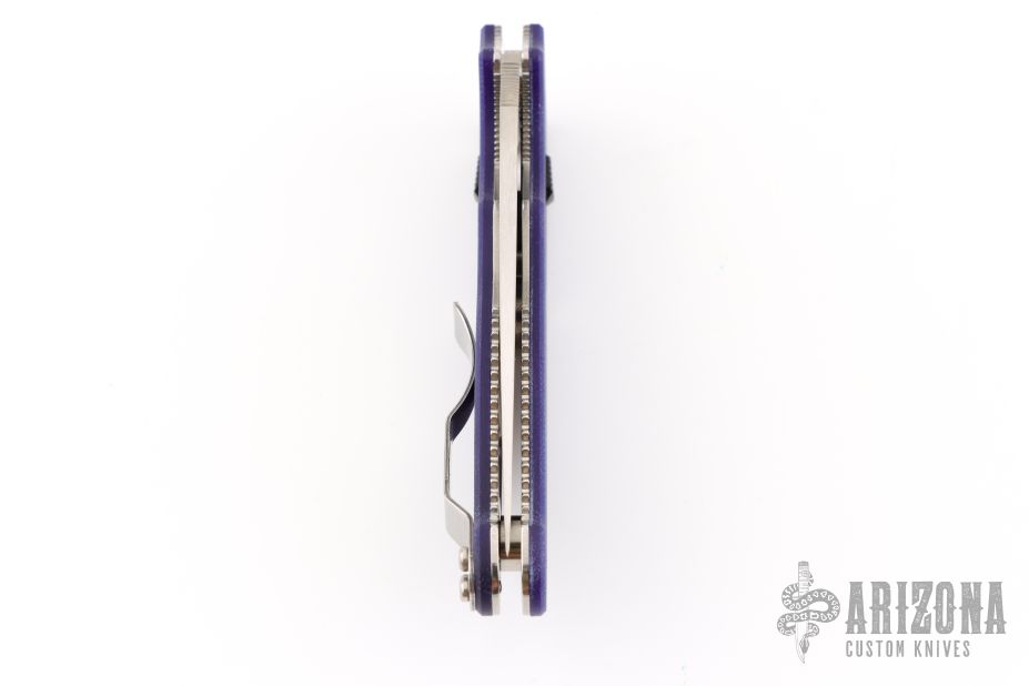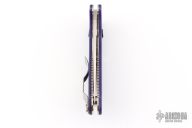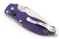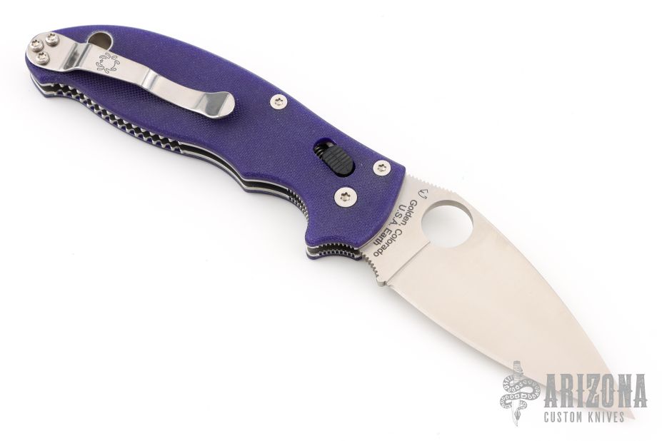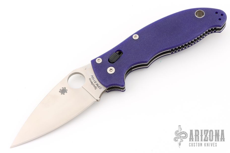 This Spyderco Manix 2 has a satin finished blade, thumbhole and notched thumbrest. The handle has a purple G-10 scales over steel liners and backspacer. Lanyard tube in pommel. Has a couple light scuffs, excellent condition.
