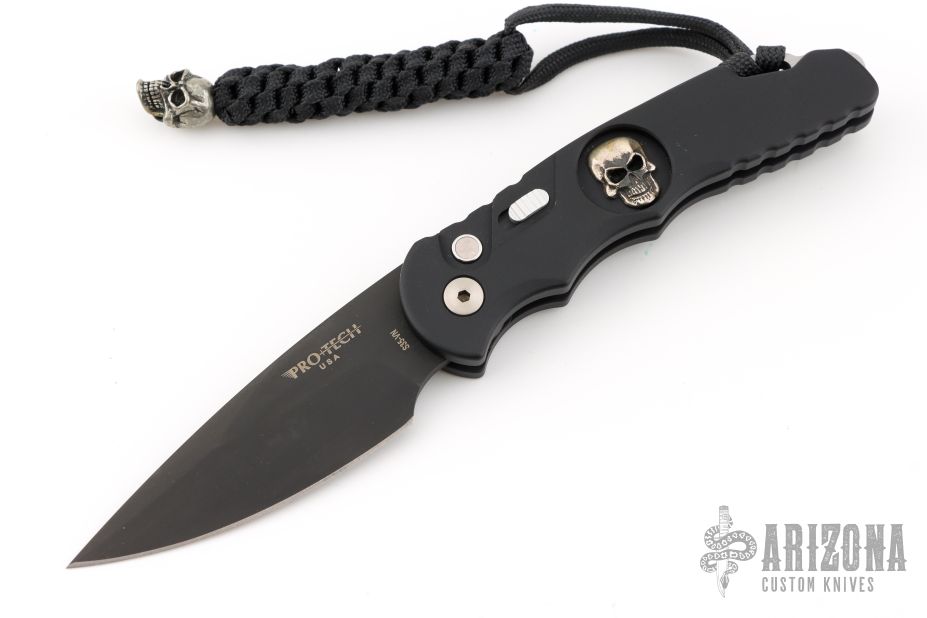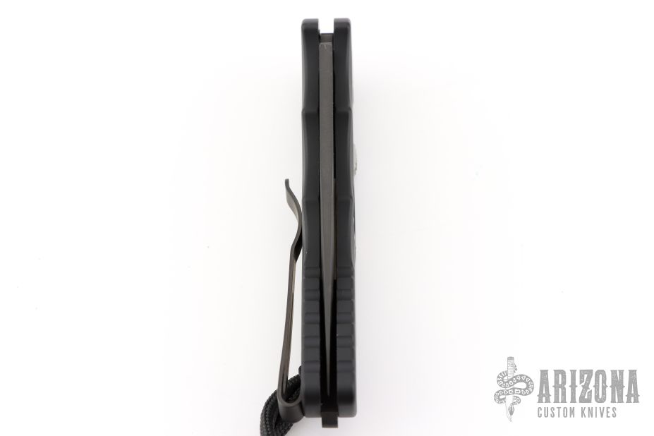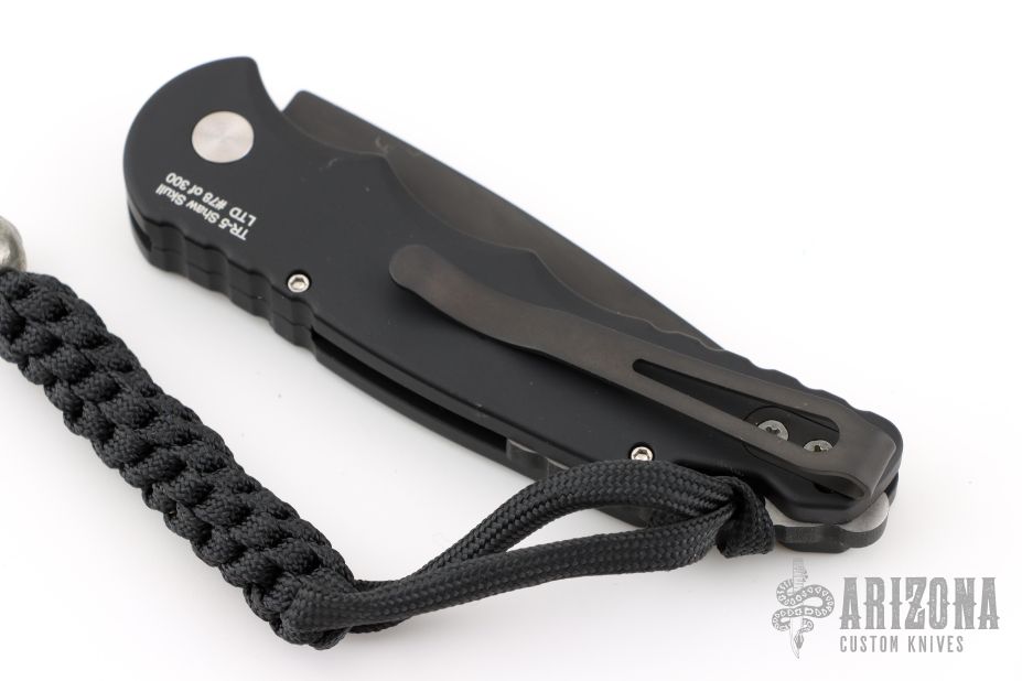 This TR-5 automatic model has a black anodized aluminum handle with a Bruce Shaw designed sterling skull inlay, mother of pearl push button, and a deep carry tip-up pocket clip. Its blade is made from CPM-S35VN stainless steel in a black DLC coated finish. A sliding safety lock allows secure pocket carry and prevents accidental blade deployment.