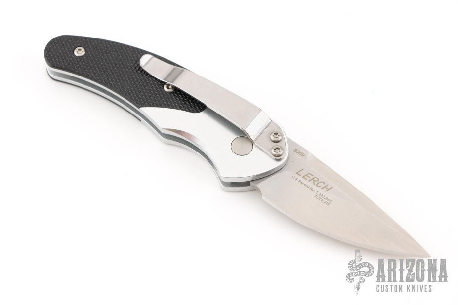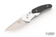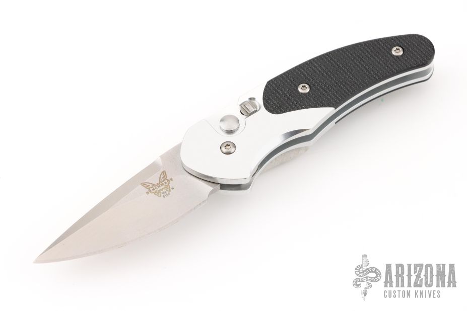 This 3150 Impel Automatic by Benchmade features a drop point blade with swedge. The handle is comprised of an aluminum frame with black G10 overlays. Push button and sliding safety on "A" side of handle The polished steel pocket clip is positioned for tip down carry. Has some light scuffs and scratches, great condition otherwise.