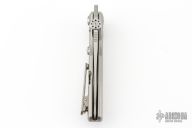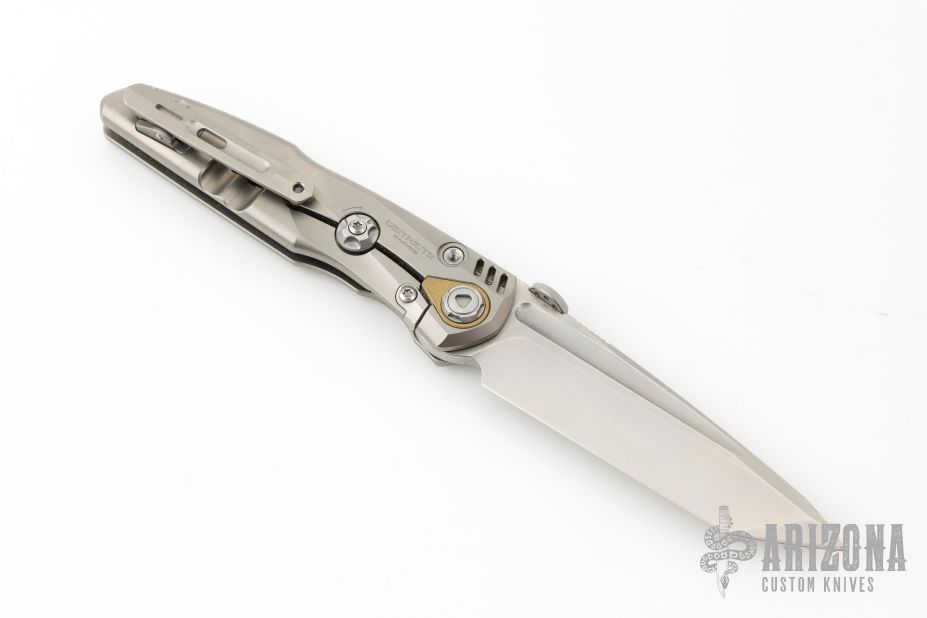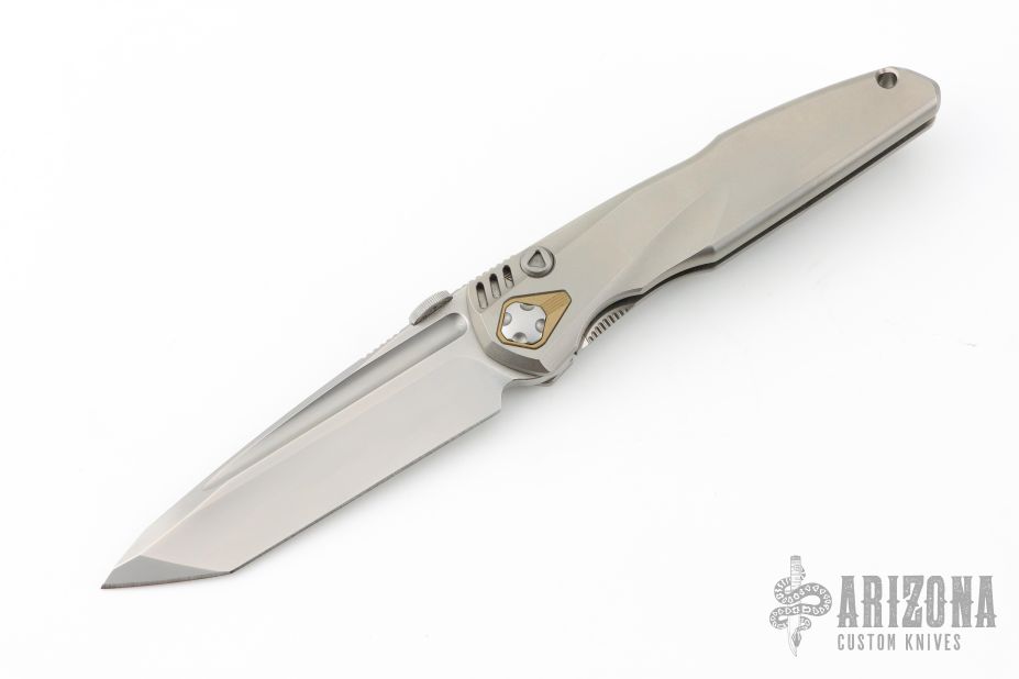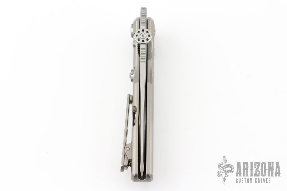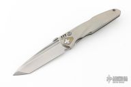 This knife features a fine bead blasted tanto blade with a knurled thumb disc. The hand has a bead blasted titanium frame with an integral contruction. matching tip up pocket clip. Excellent Condition.