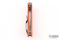 This Appalachian by Emerson Knives features a stone wash finished clip point blade with notched thumbrest, thumbdisc and wave feature. The handle has orange G-10 scales, titanium liners, tip up black stainless steel clip. Has some scuffs and scratches, great condition otherwise. S/N 0110