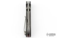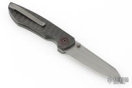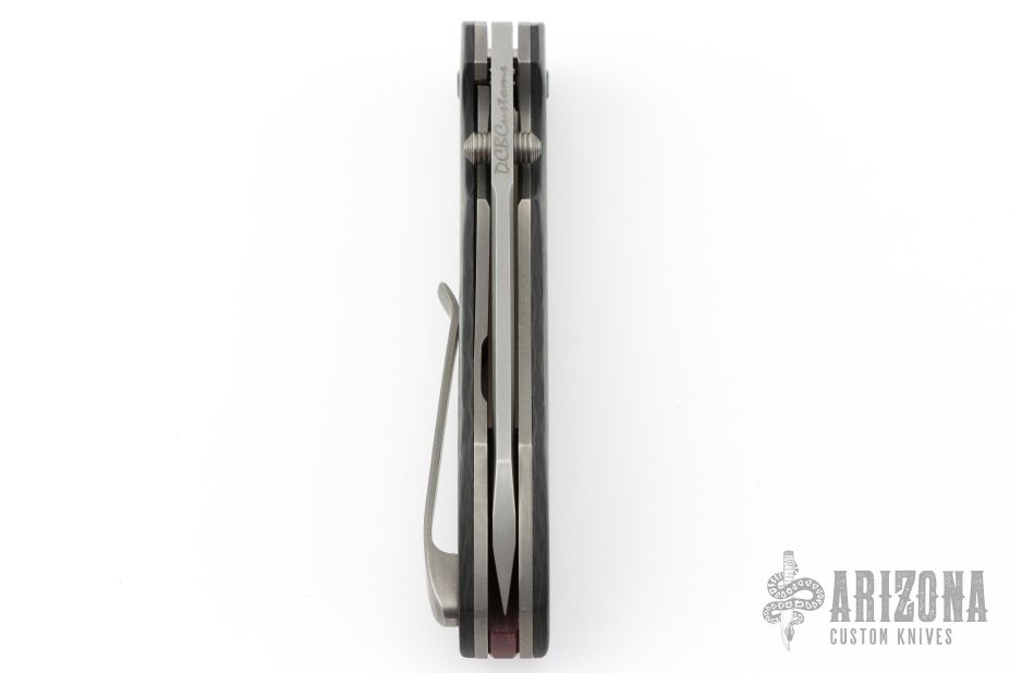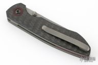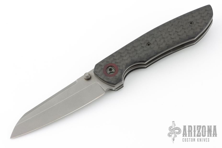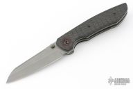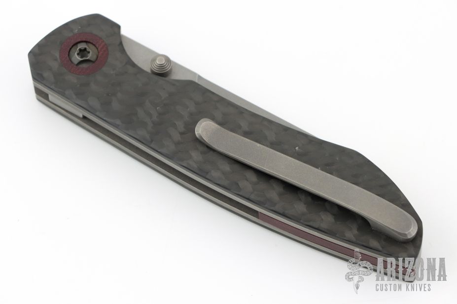 This linerlocking folder features a tumbled sheepsfoot blade with dual thumbstuds. The handle has a carbon fiber frame with micarta pivot collars/backspacer titanium liners and a matching tip-up pocket clip. Excellent Condition.