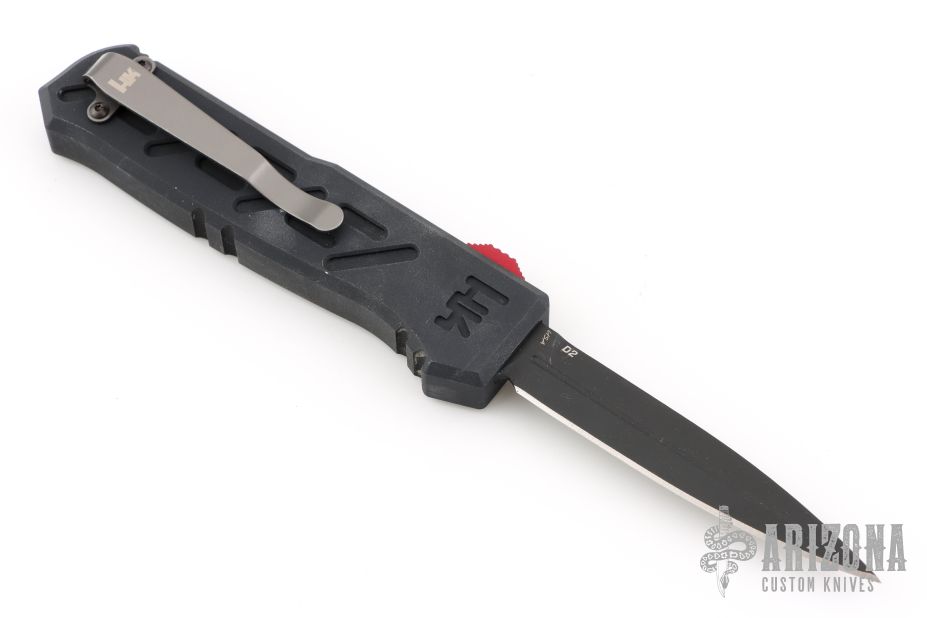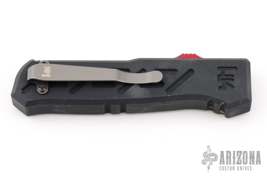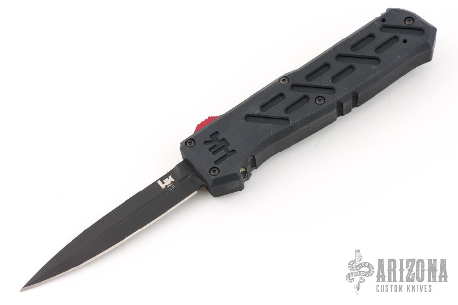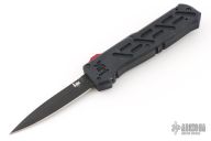 This Epidemic OTF was made by Benchmade for Heckler and Koch. It features a black finished spear point blade with false top edge. The handle is comprised of black machined aluminum with a tip down carry pocket clip. Has scuffs and scratches, good condition otherwise.