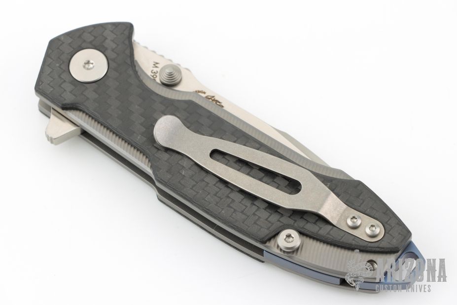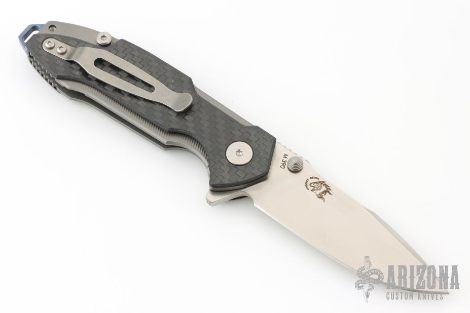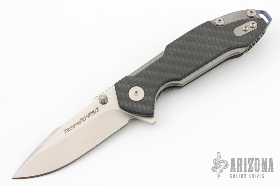 This Storm Flipper was designed by Rick Hinderer and made by Viper Knives.  The knife has a satin finished blade with dual thumbtsuds and a notched thumbrest/flipper.  The handle has carbon fiber scales over titanium liners with a matching tip up pocket clip.  Excellent Condition.