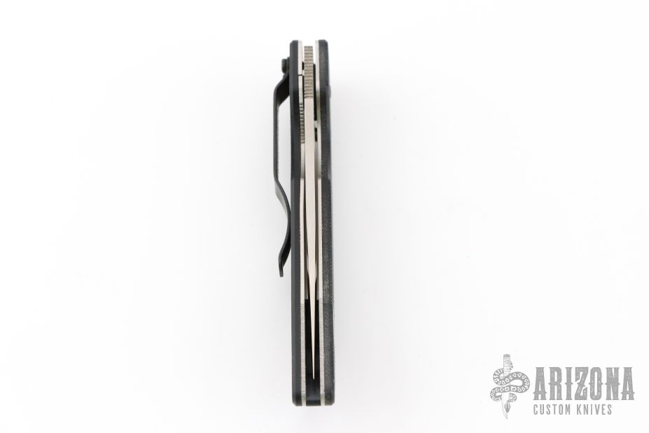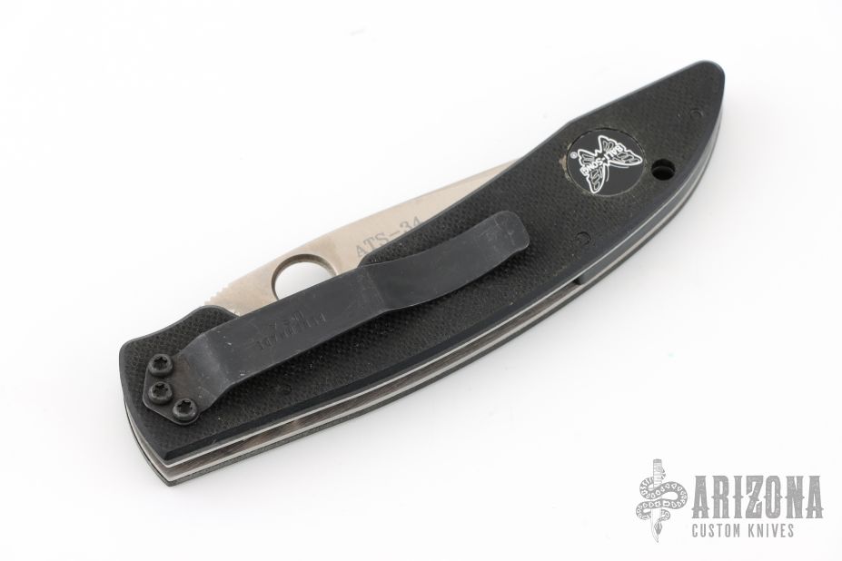 This Mini AFCK linerlock folder from Benchmade has a satin finished blade with thumb hole, and notched thumbrest. Handle is black G10 over stainless liners, black fiber back spacer, lanyard hole. Has a couple light scuffs, excellent condition otherwise.