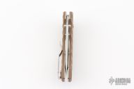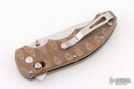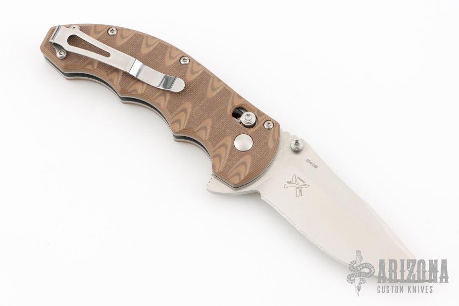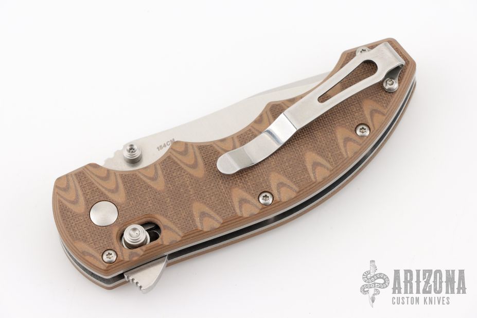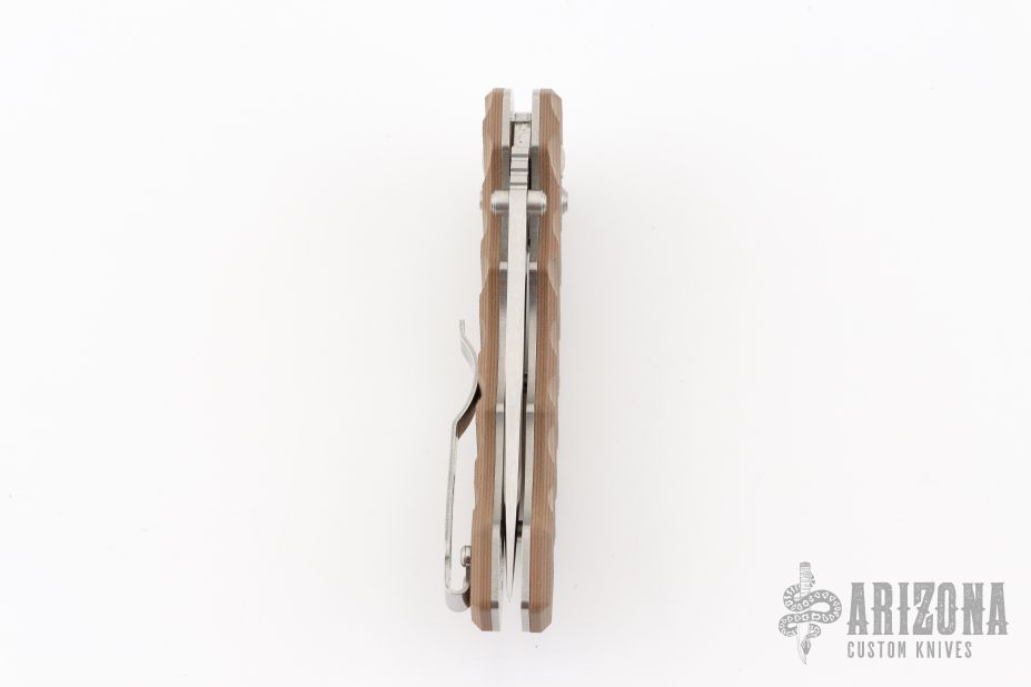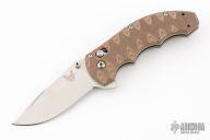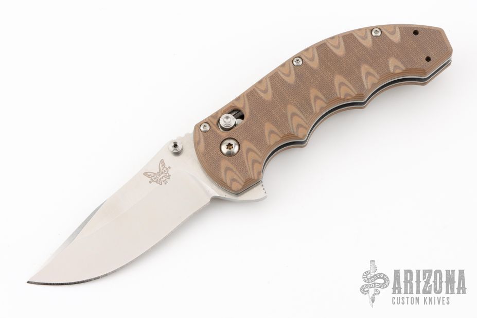 This Axis Lock flipper is a Ball Custom Knives Design executed by Benchmade. The tumble finished clip point blade has a swedge, dual thumb studs, notched thumbrest and flipper. The handle is comprised of sculpted tan and brown G10 scales over skeletonized steel liners and standoffs. AXIS locking mechanism. Has a couple light scuffs, excellent condition otherwise.