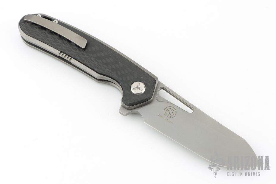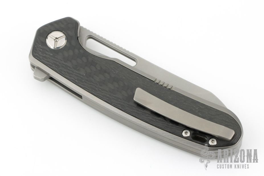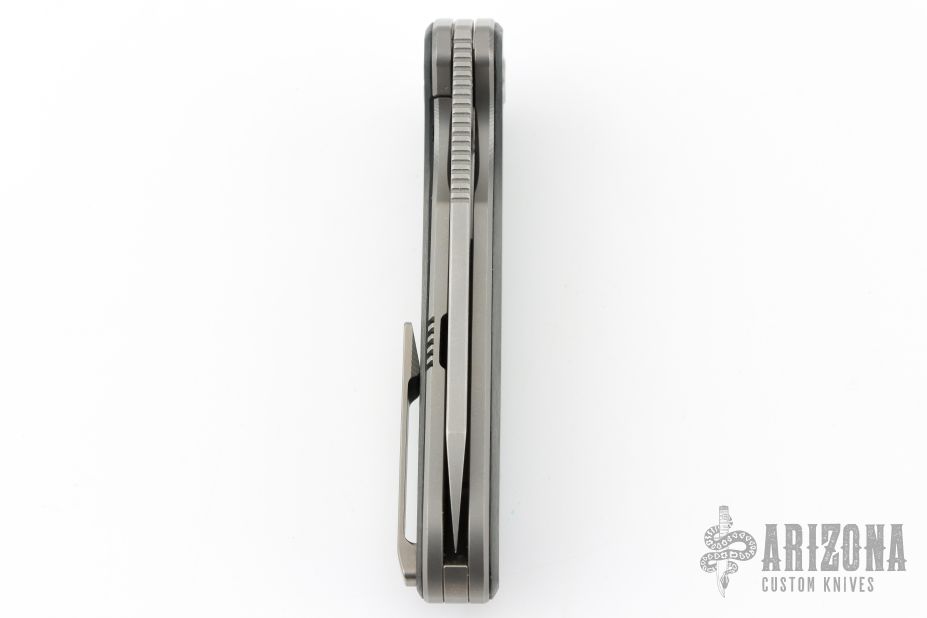 This Framelock Flipper by TwoSun knives features a satin finished blade with notched flipper. The handle has a milled and tumbled titanium frame with carbon fiber inlay, a stainless steel lockface insert, titanium tip up clip and backspacer. Rides on bearings, nice detent, lockup and blade seating. Excellent Condition.