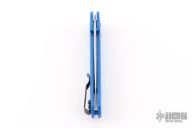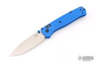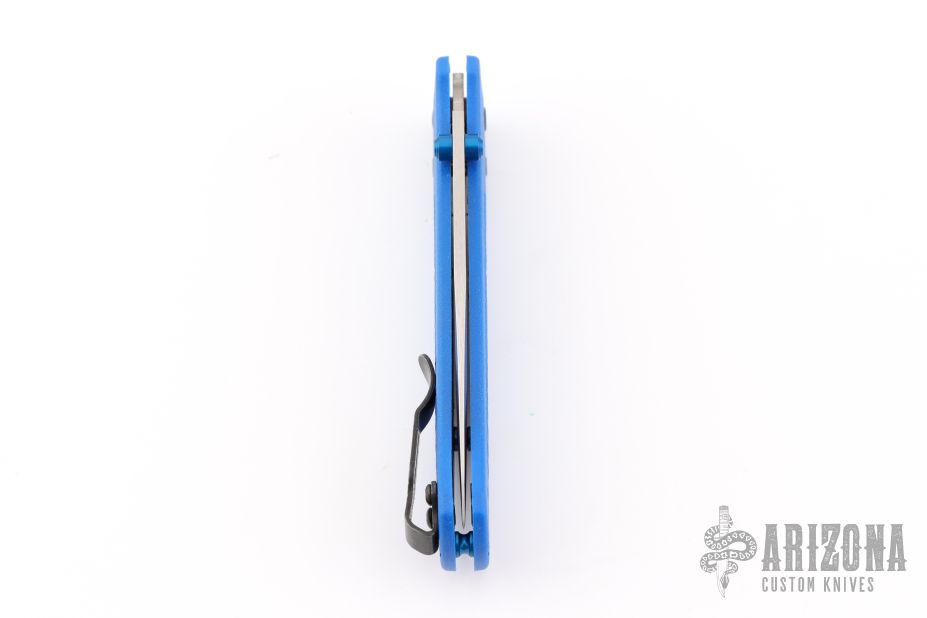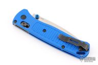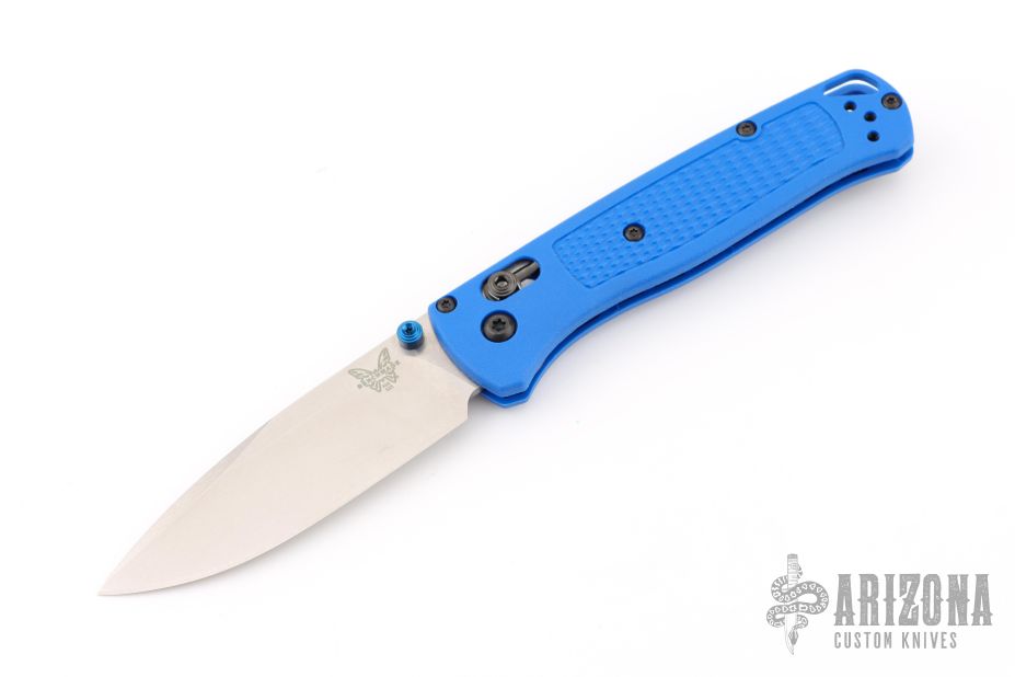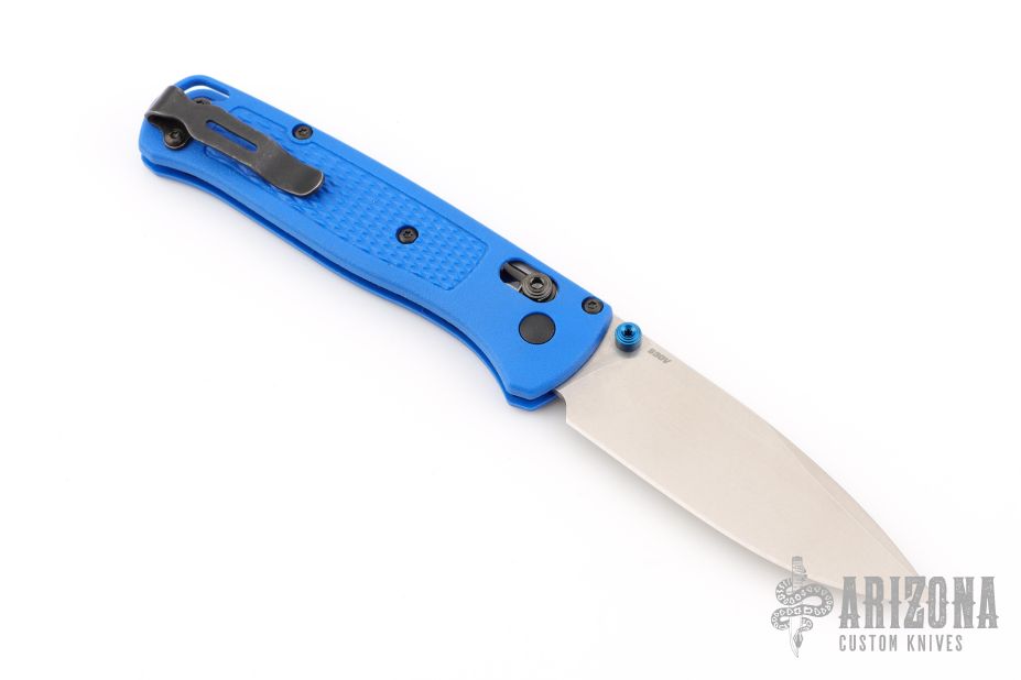 The Benchmade Custom Bugout features a drop point blade with a stonewashed finish. It's a manual opener with ambidextrous thumb studs. This AXIS lock has blue handles with black hardware, a mini deep-carry pocket clip, and a lanyard hole. Has some scratches on the clip, excellent condition.