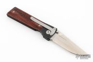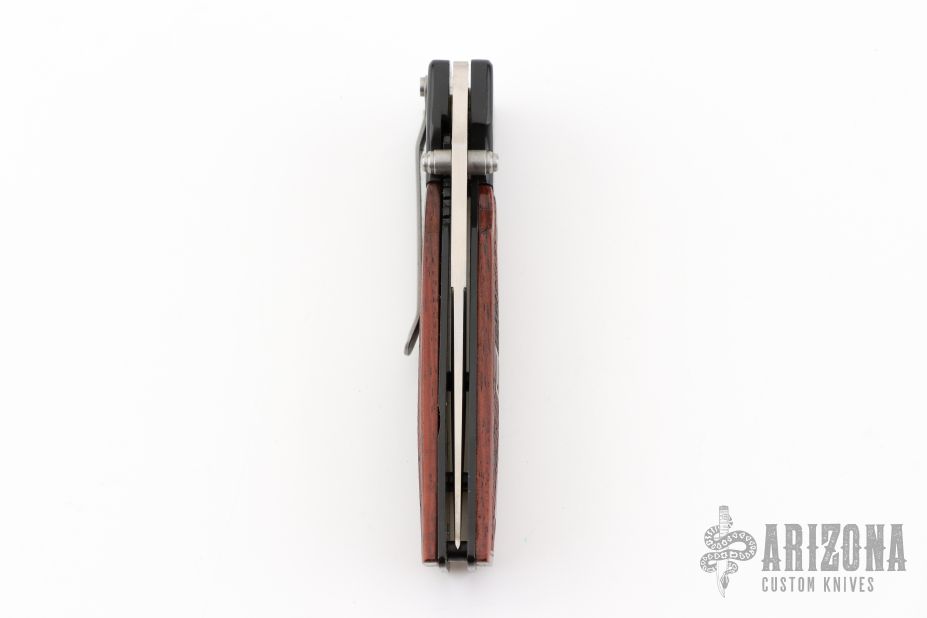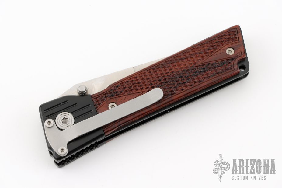The knife was designed to mimic the 1911 U. S. 45 Cal. pistol. This knife features a clip point blade with a false top edge and dual thumbstuds. The handle is composed of black steel frame and bolsters and 1911 style wood scales. The tip down pocket clip is composed of bead blasted stainless steel. Marked "First Production Run" on the blade.  Has some light scuffs, excellent condition otherwise.