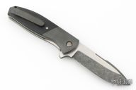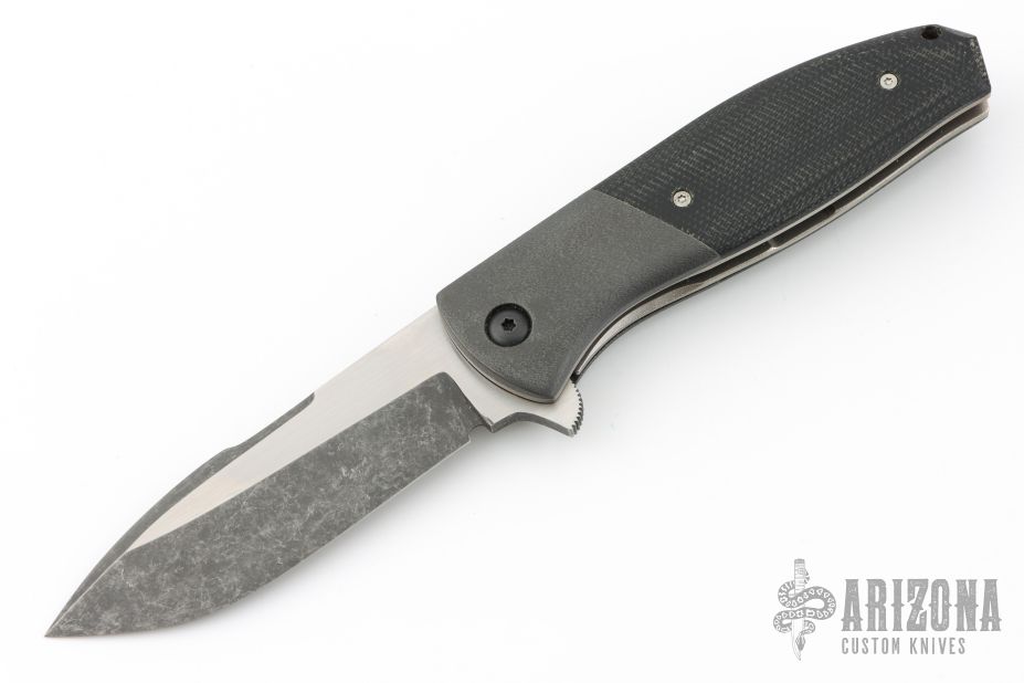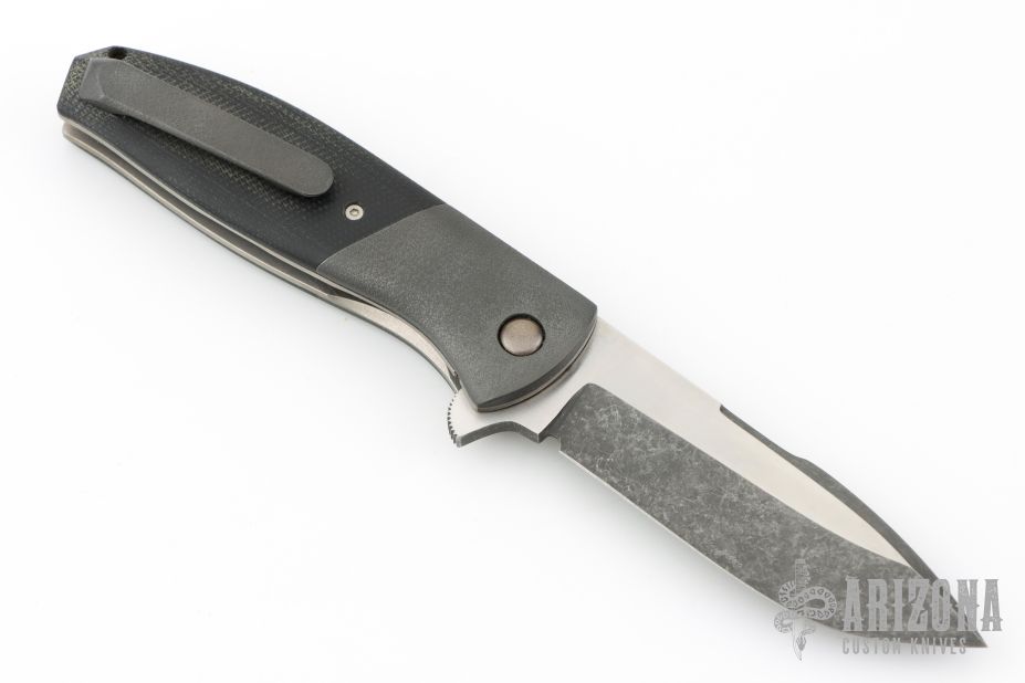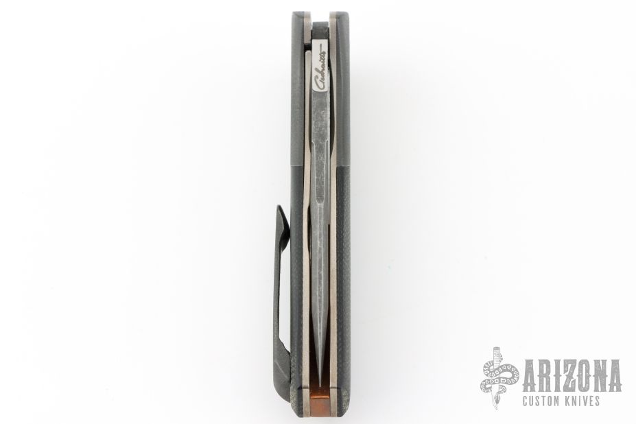 This Flipper by Chuck Gedraitis features a two-tone finished clip point blade, with hand rub satin finished flats, acid/tumble bevels, and notched flipper. The handle has orange peel finished zirconium bolsters, orange peel finished zirconium tip up clip with hidden screws, black micarta scales, orange peel finished titanium liners and copper backspacer. Rides on washers, nice detent, and action. Excellent Condition.