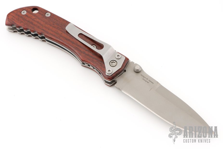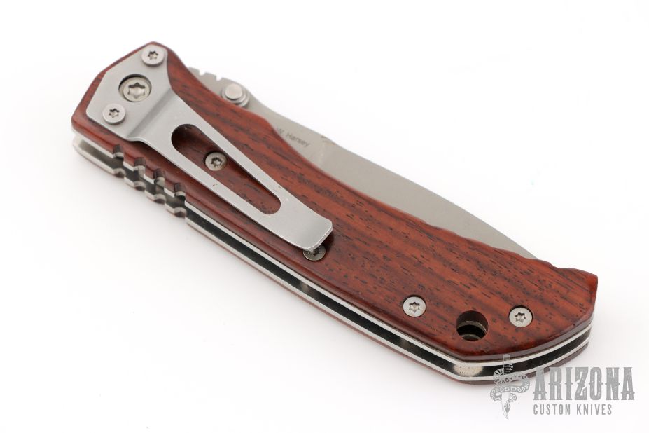 This Harsey T1 Tactical by Lone Wolf Knives features a bead blast finished spear point blade with false top edge, notched thumbrest and dual thumbstuds. The handle has rosewood scales, stainless steel liners and tip down clip. Has a couple light scuffs and scratches, great condition otherwise.