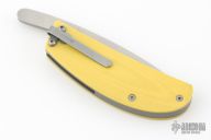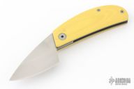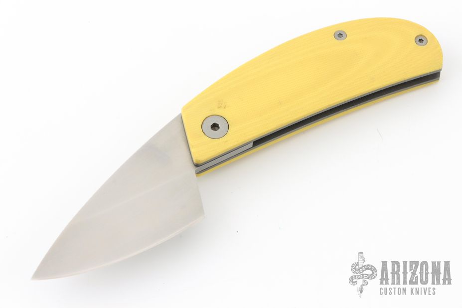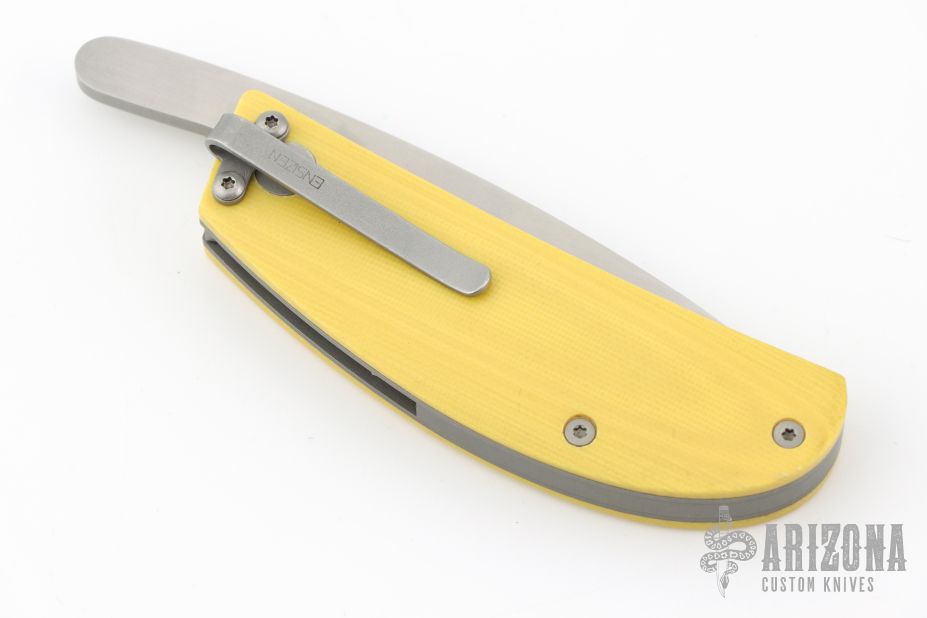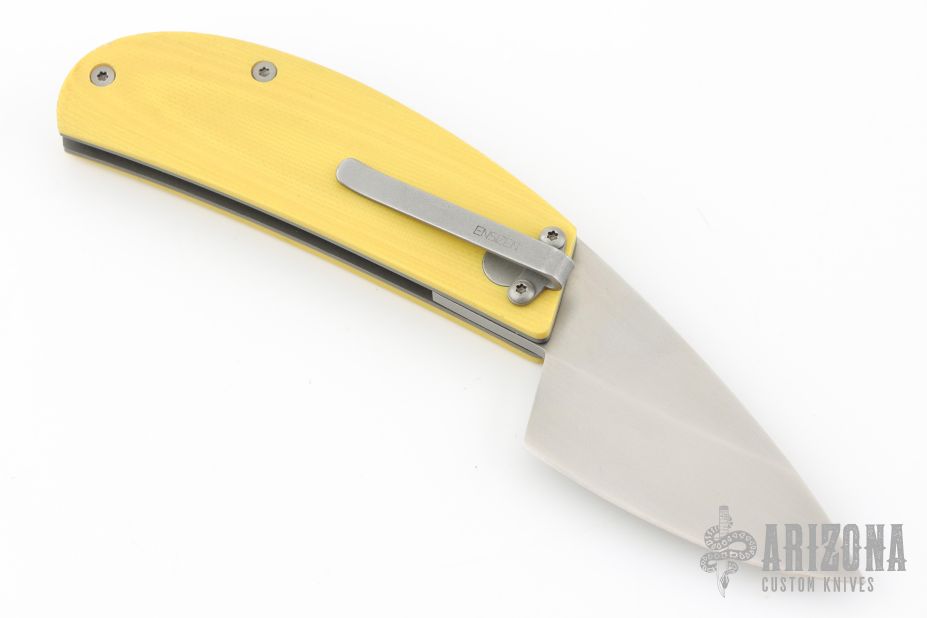 This knife by Filip De Coene of Ensizen features a bead blasted wharncliffe style blade with friction folder style opening. The handle has G10 scales and titanium liners over a bead blasted barrel spacer. Some minor carry marks in the bead blast finish of the screws but overall great condition.