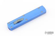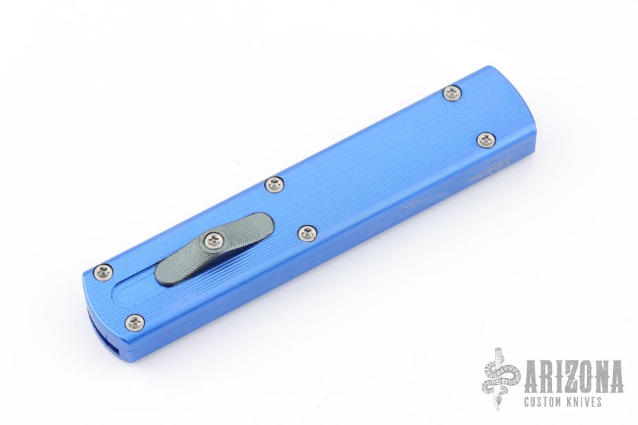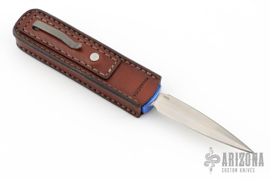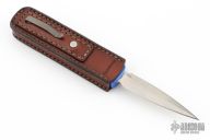 This Zulu Spear by Darriel Caston features a satin finished double edged blade. The handle has a blue aluminum frame with leather sheath and tip down clip. Excellent condition.