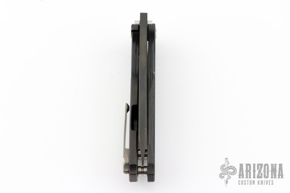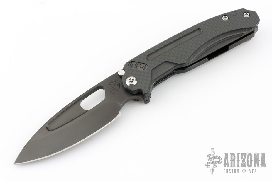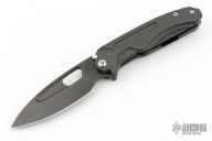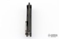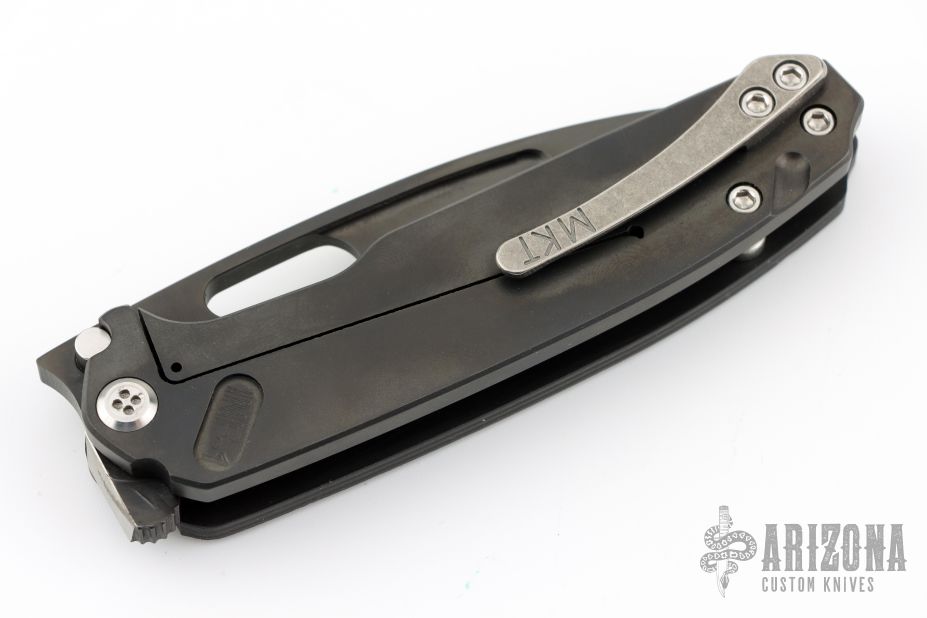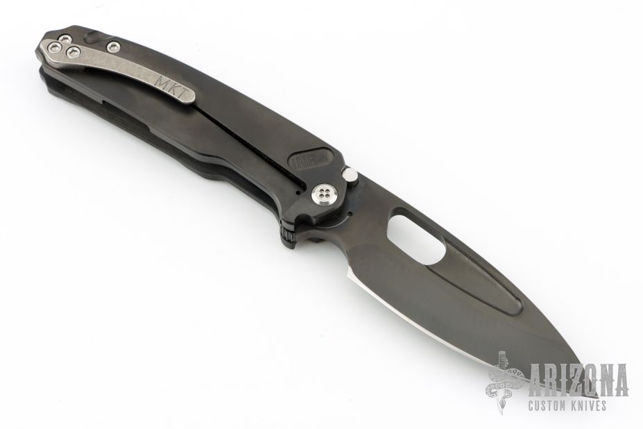 The Infraction by Medford Knife and Tool features a PVD coated drop point blade with a recess and oversized thumb hole. The handle is composed of PVD coated titanium and carbon fiber. The tip up carry pocket clip is composed of titanium. Smooth action and strong detent. Excellent Condition.