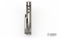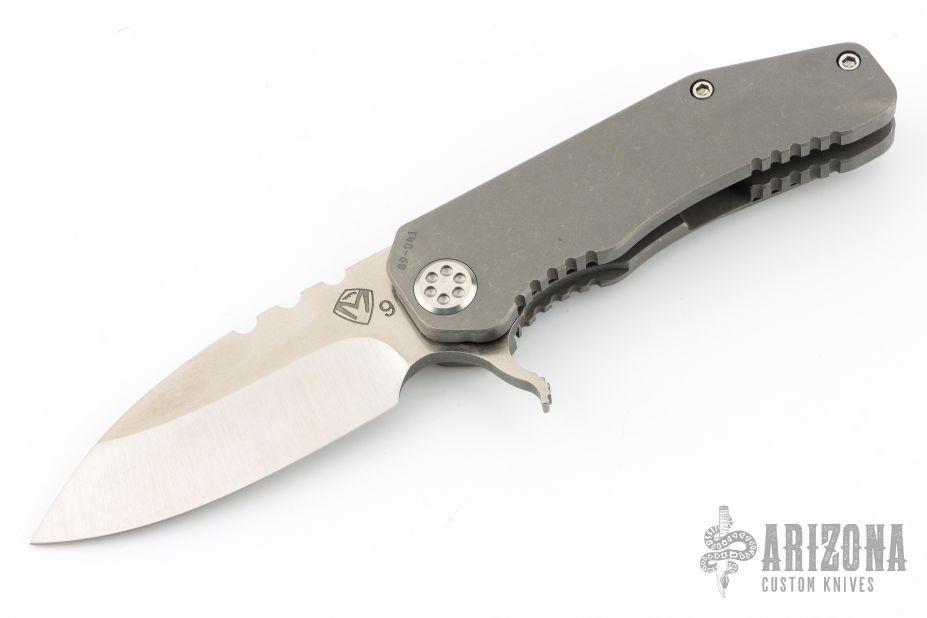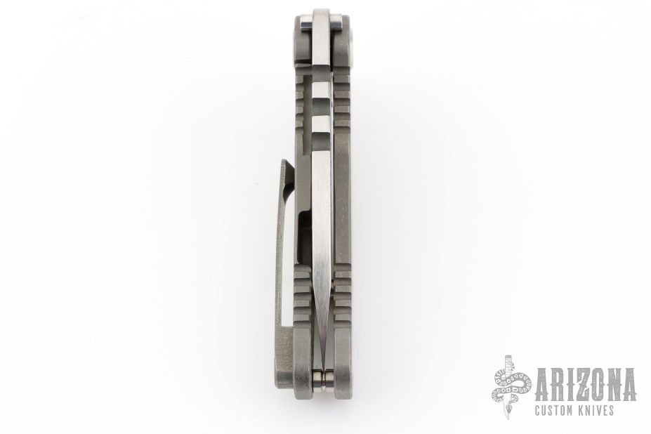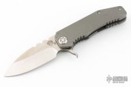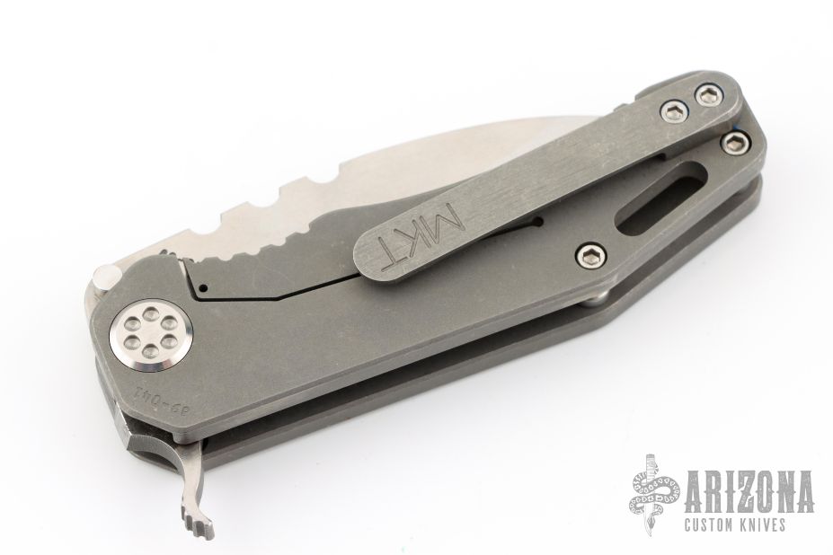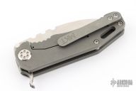This 187F by Medford Knife and Tool features a stonewash drop point blade with notched thumbrest and flipper. The handle has a tumble finish titanium frame and tip up titanium clip.  Nice detent, lockup and blade seating. Has a couple light scuffs, excellent condition otherwise.