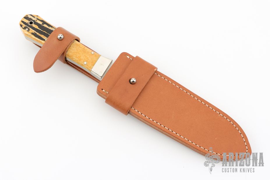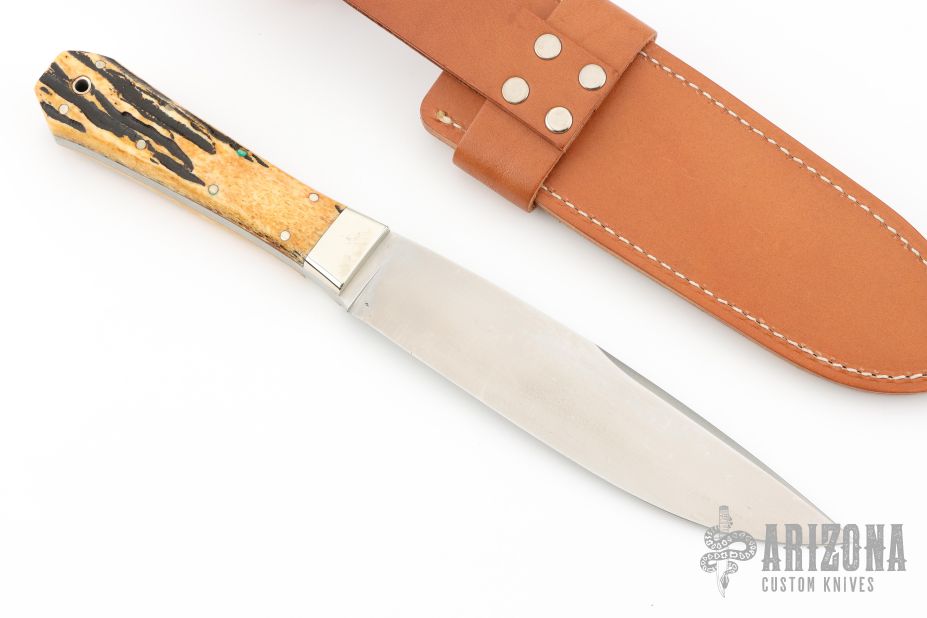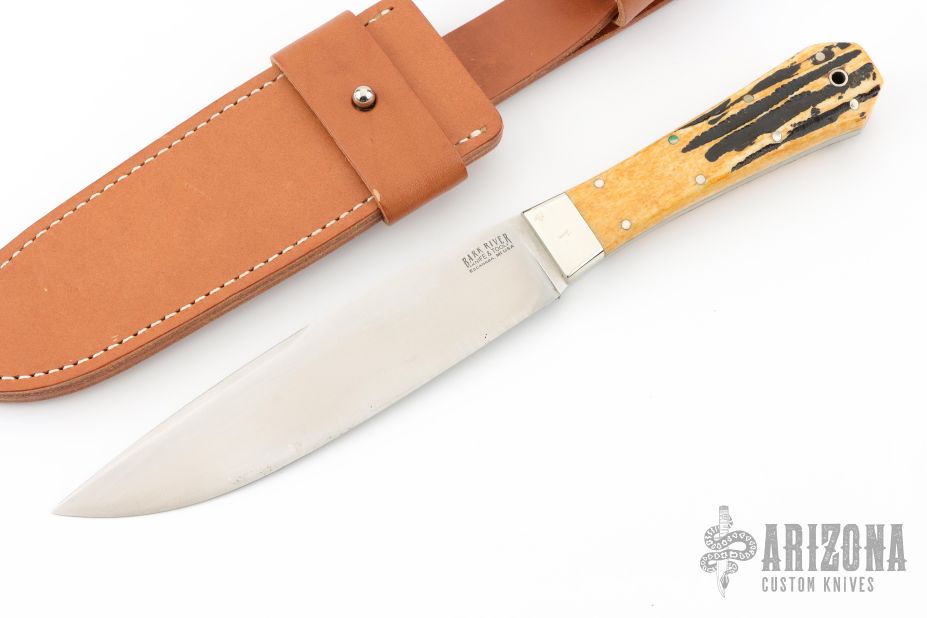This knife by Bark River features a satin finished blade with swedge, .205" blade stock and 1.468" blade depth, full tang construction. The handle has nickel silver bolsters, pins, lanyard hole, and nice stag slabs. Comes with a leather sheath. Has some scuffs and patina. Excellent condition otherwise.