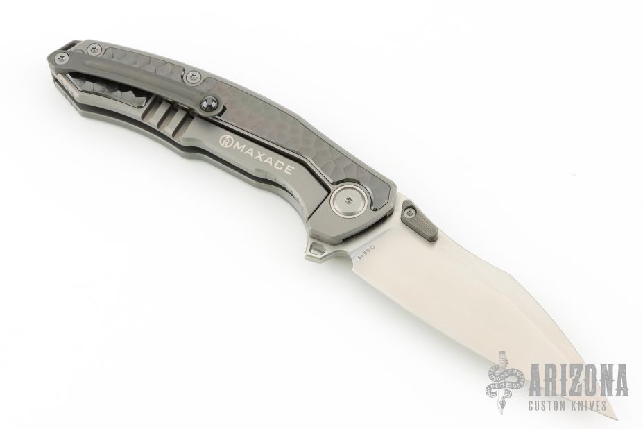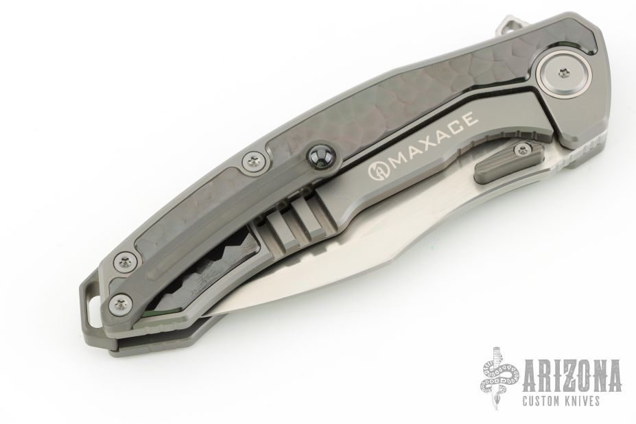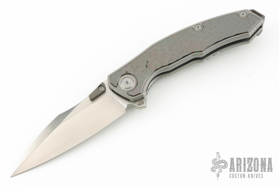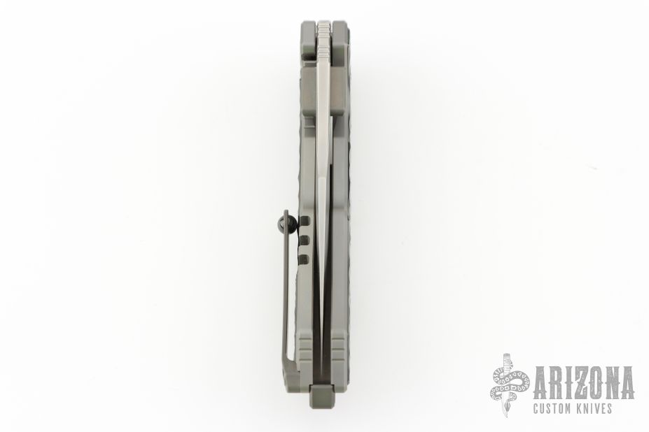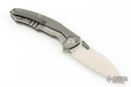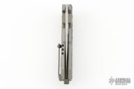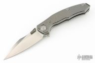 This knife features a satin finished blade with dual thumbstuds. The handle has a titanium frame with a matching tip-up pocket clip and backspacer. Sculpted zirconium inlays. Excellent conditiion.
