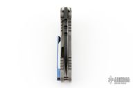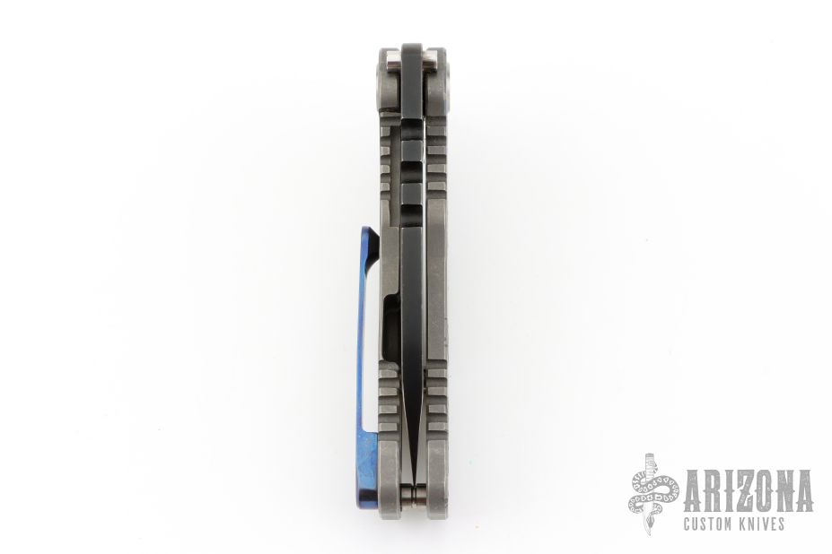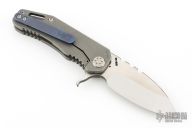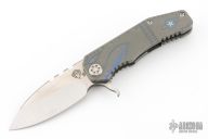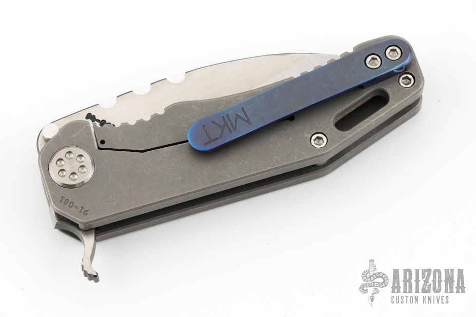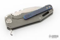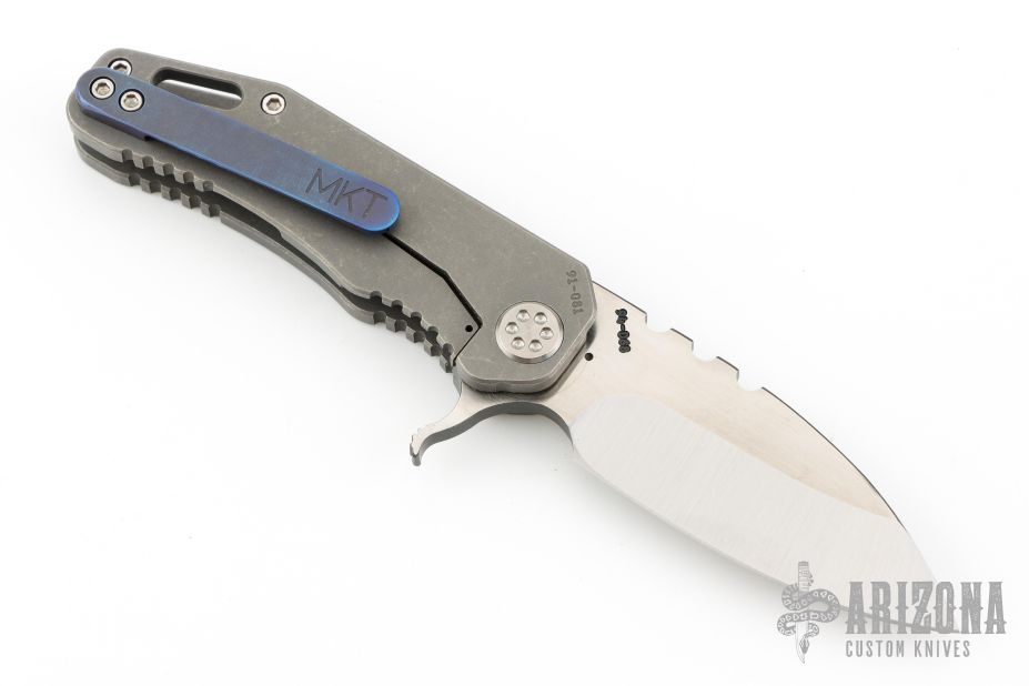 This 187F by Medford Knife and Tool features a satin finished drop point blade with notched thumbrest and flipper. The handle has a tumbled titanium frame and tip up titanium clip.  Nice detent, lockup and blade seating.  Comes with original box, and papers with soft case. Has some light scratches, great condition otherwise.