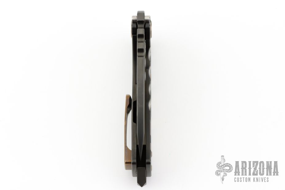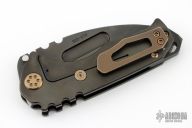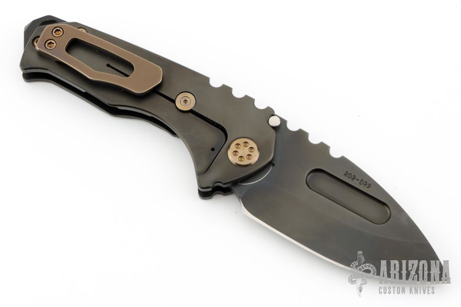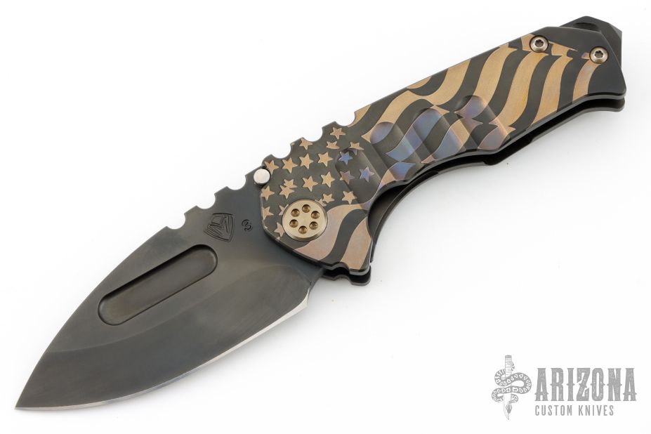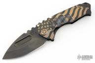 This Praetorian Genesis T from Medford Knife and Tool features a PVD coated drop point style blade with fuller, notched thumb rest and dual thumb studs. The handle has an "American Flag" titanium frame over a D2 backspacer/glass breaker. Black titanium tip up clip. Great blade seating, detent and lock up. Includes the original box, case, and papers. Excellent condition.