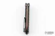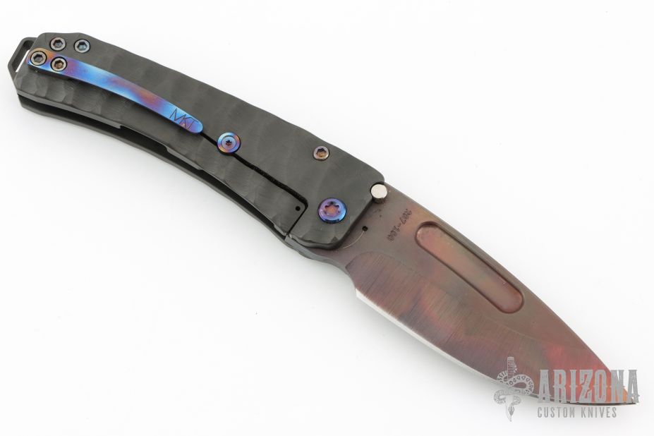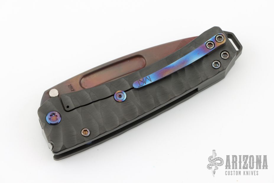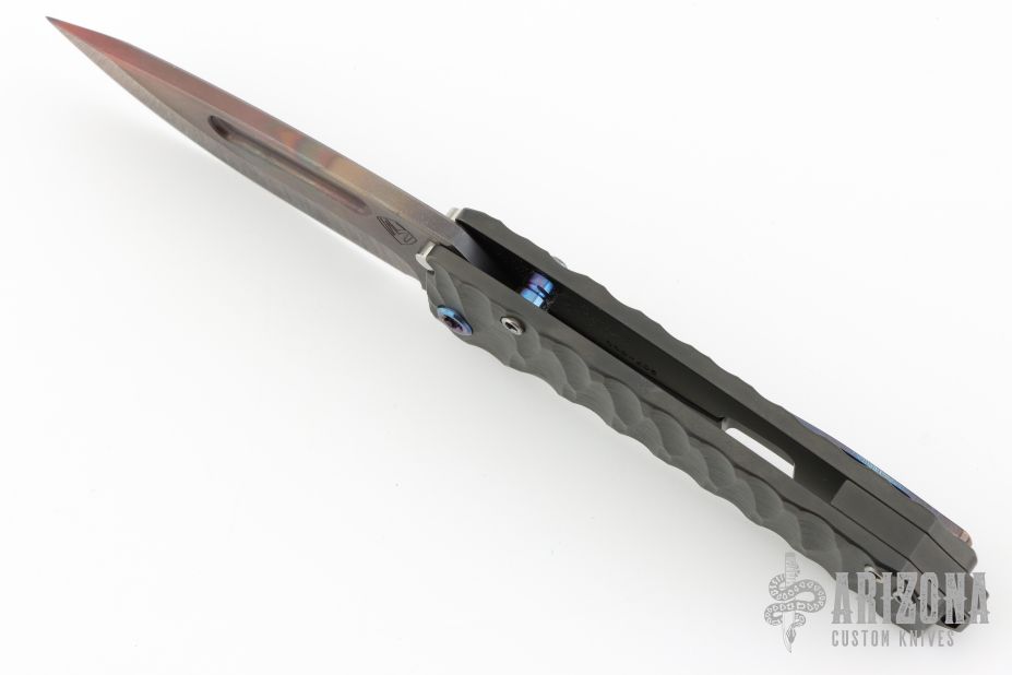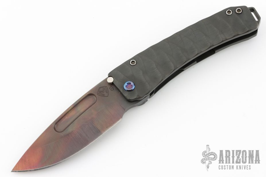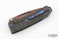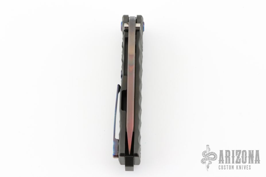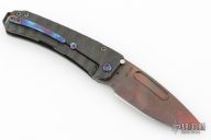 This Midi Marauder from Medford Knife and Tool features a Vulcan finished drop point style blade with tumbled fullers.  The handle has a carved and PVD "Predator" finish, with exposed lanyard bail in backstrap. Excellent detent, lockup, and seating. Original case and papers. Excellent condition.