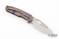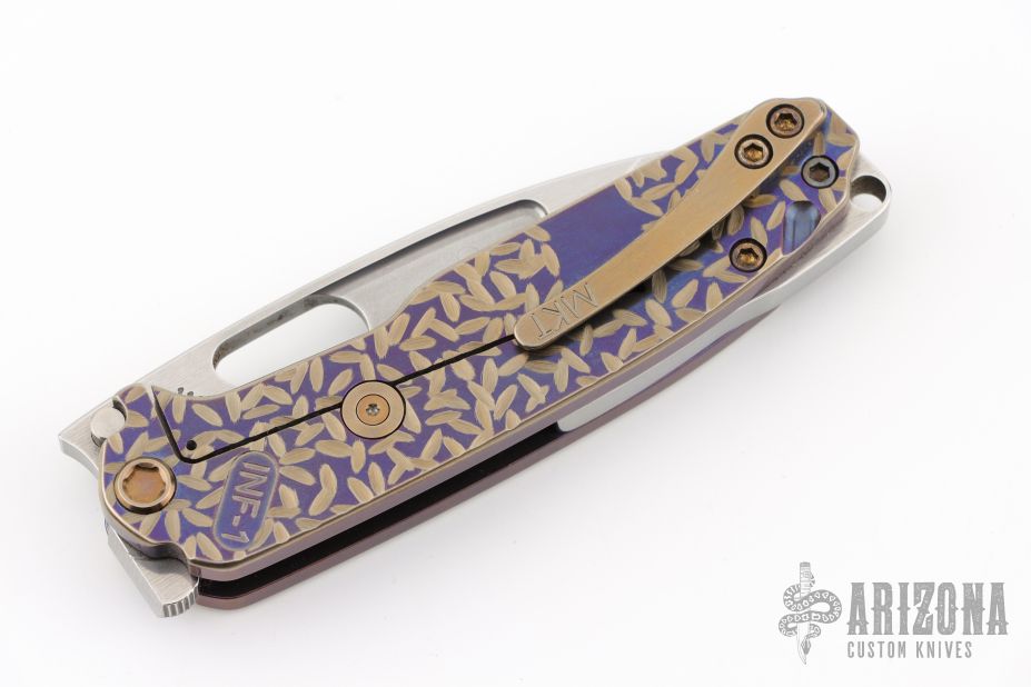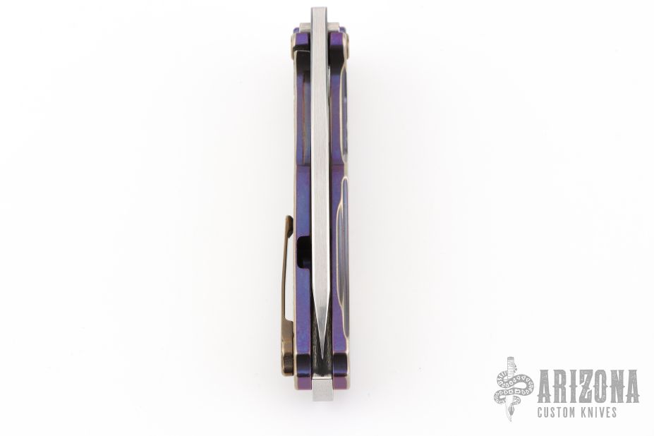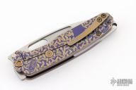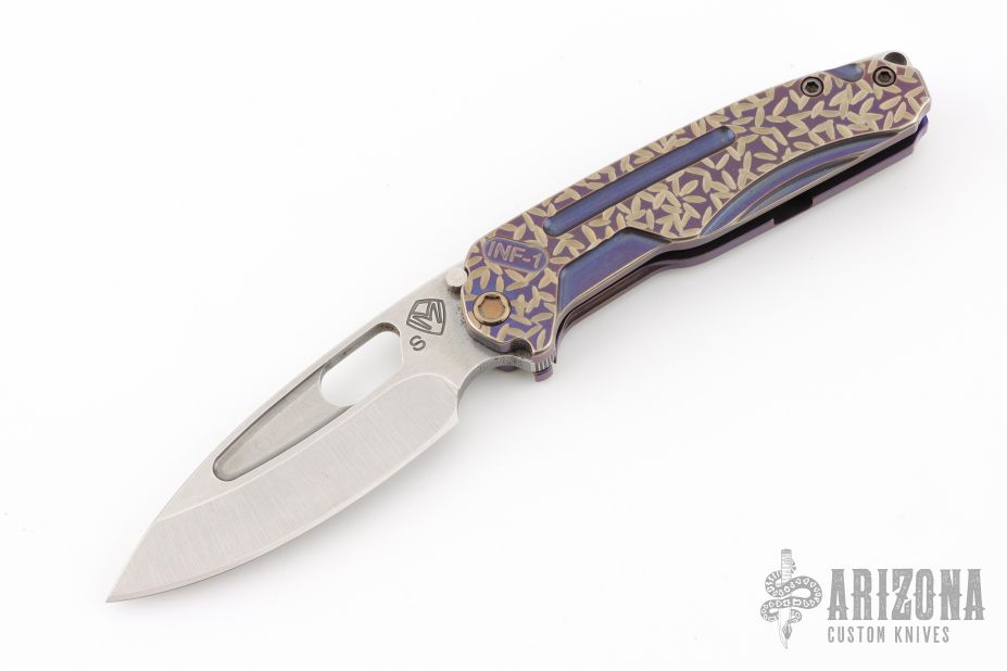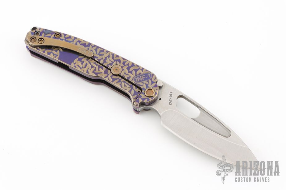 The all Titanium Infraction, by Medford Knife and Tool features a satin finished drop point blade with a recess and oversized thumb hole. The handle is composed of anodized titanium. The tip up carry pocket clip is composed of anodized titanium.  Nice detent, lockup and blade seating. Comes with original box, case, and papers. Has a couple light scratches, excellent condition otherwise.
