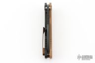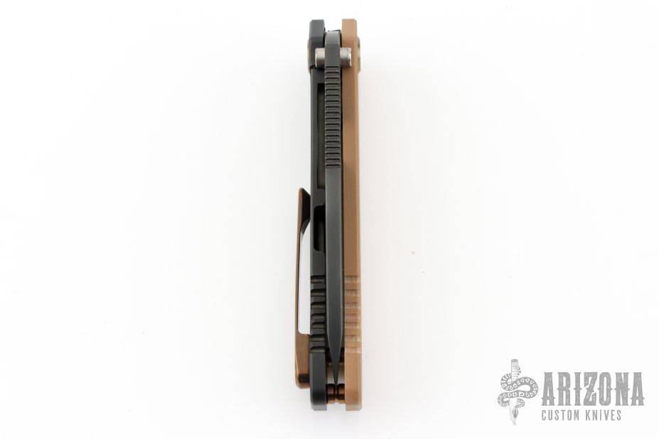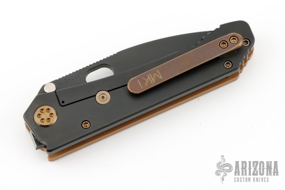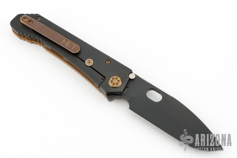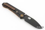 This 187 DPT Drop Point by Medford Knife and Tool features a black PVD blade with notched thumbrest and thumbhole. The handle has a stonewashed and anodized titanium frame and matching clip and satin hardware. Nice blade seating, detent and lockup. Comes with original box, zipper case and papers. Has a couple light scuffs, excellent condition otherwise.