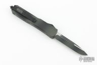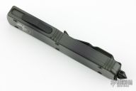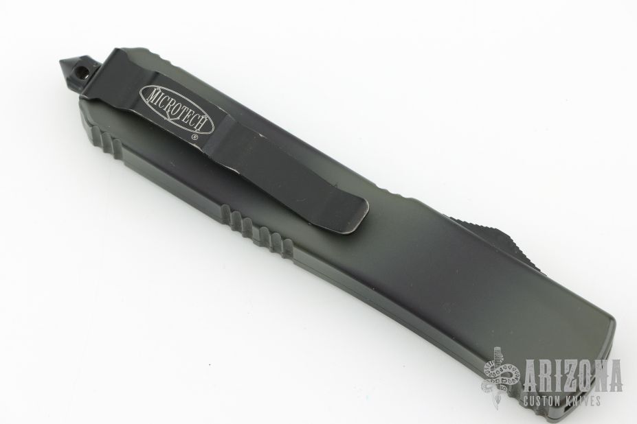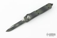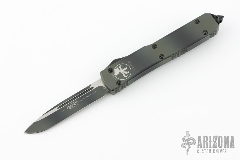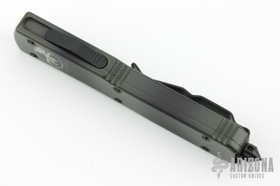 This Ultratech OTF automatic by Microtech features an S/E black finished blade with a standard edge. Green Camo aluminum frame with black hardware and stainless steel clip. Glass breaker. Serial number 53250 and dated 03/2015. Comes with original box and papers. Has some light scratches, great condition otherwise.