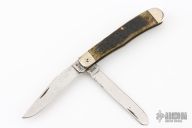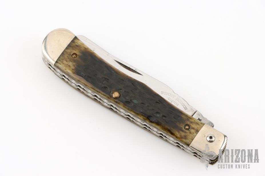 This Trapper by Case knives has been modified by Tommy Hudson. It features mirror polished blades with nail nicks. The blade spines, and edges of the bolsters have been file-worked. The handle has nickel silver bolsters, jigged bone covers, brass liners and file worked stainless springs. Comes in a Hogue zipper case. Has some light scuffs and scratches, great condition otherwise.