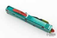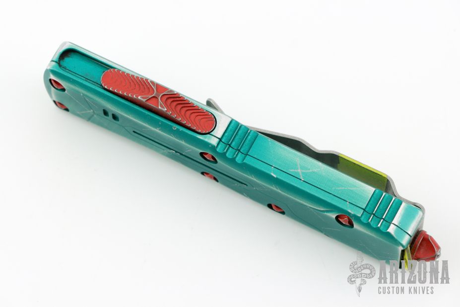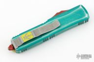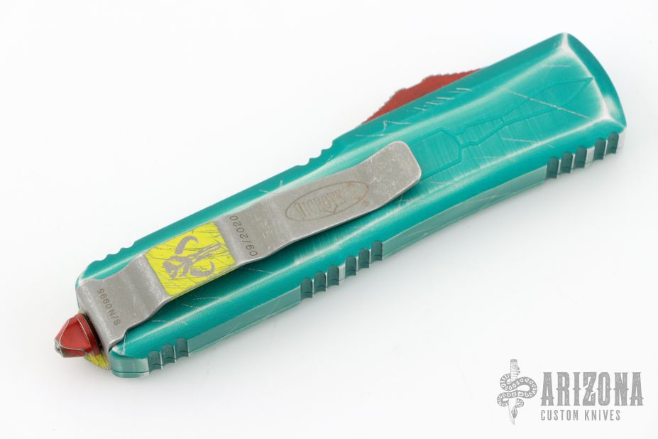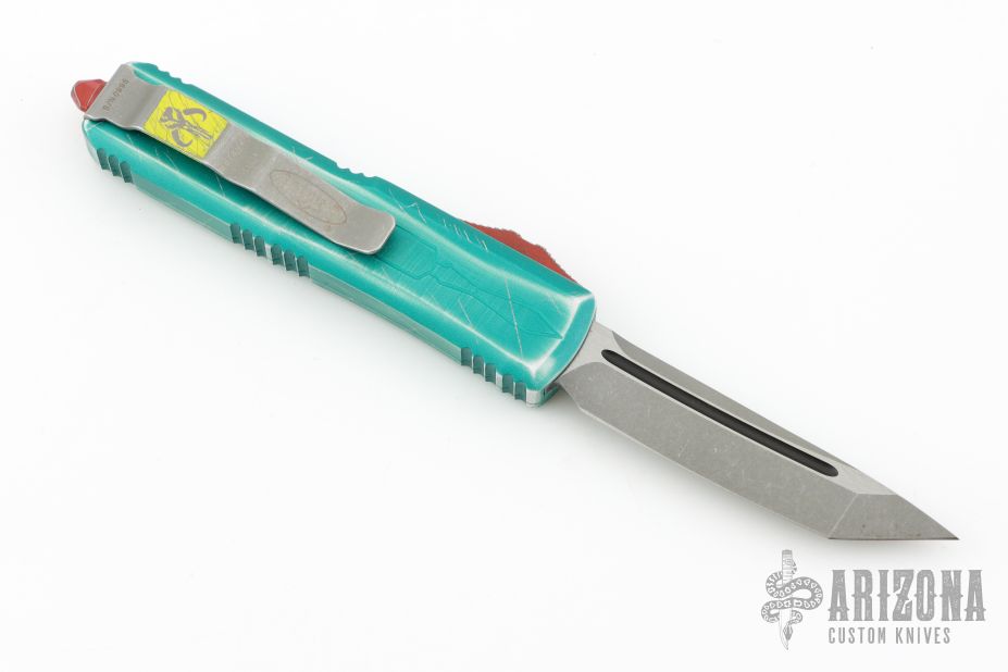 This UTX-85 Bounty Hunter by Microtech features a tanto blade with fullers, satin flats and apocalyptic finished grinds. The handle has a green battle worn aluminum handle with red hardware, tip down apocalyptic finished stainless steel clip. Comes with original box and papers. Excellent condition. S/N 0995 and dated 09/2020.