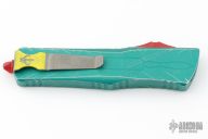 This Combat Troodon by Microtech features an Apocalyptic finished tanto blade. The handle has a distressed green aluminum frame with red hardware and a tip down stainless steel clip. Comes with original box and papers. Dated 05/2022 and s/n 1960. Excellent condition.