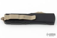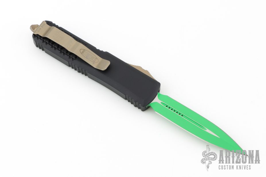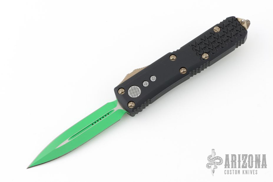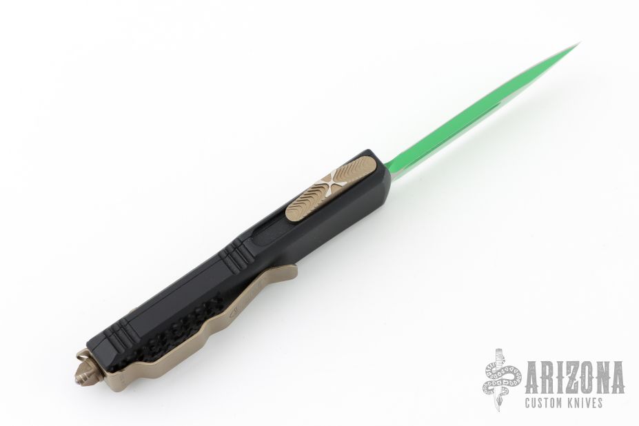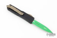 This UTX-85 OTF Automatic from Microtech features a green cerakoted double-edged blade with fuller. The handle has a black aluminum tri grip frame with bronzed steel thumb slide, clip and glass breaker. Dated 04/2021 with an S/N of 5113. Excellent condition. Comes with original box and papers.