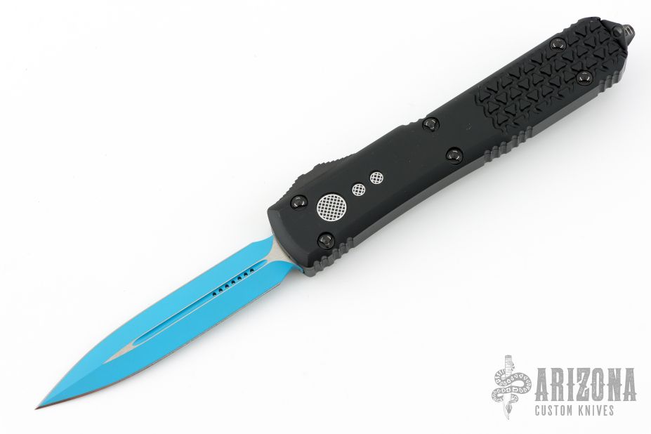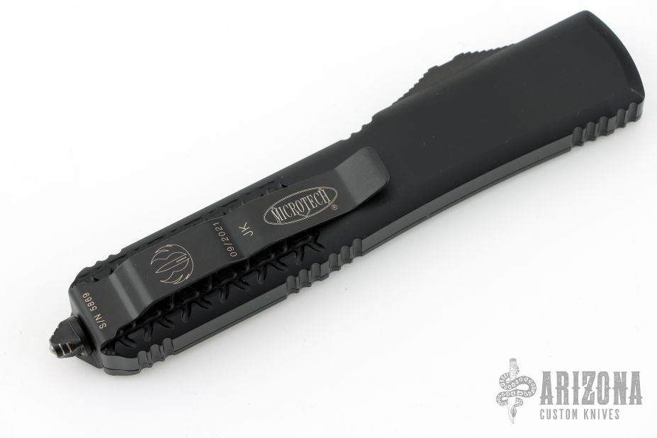 This Ultratech OTF automatic by Microtech features a D/E blue blade. Black aluminum contoured frame with black tip down stainless steel clip. Dated 09/2021 and s/n 5869. Comes with original box and papers. Excellent condition.