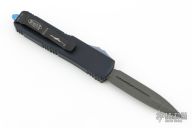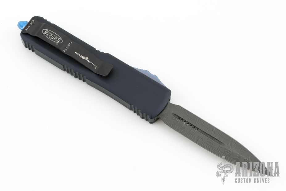 This UTX-85 OTF automatic by Microtech knives features a D/E Damascus blade. The handle has a black aluminum handle with blue hardware, and a black stainless steel tip down carry. Glass breaker. S/N 038 Dated 06/2019. Comes with original box and papers. Has a couple light scuffs, excellent condition otherwise.