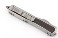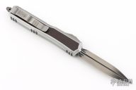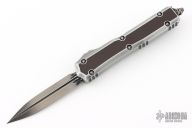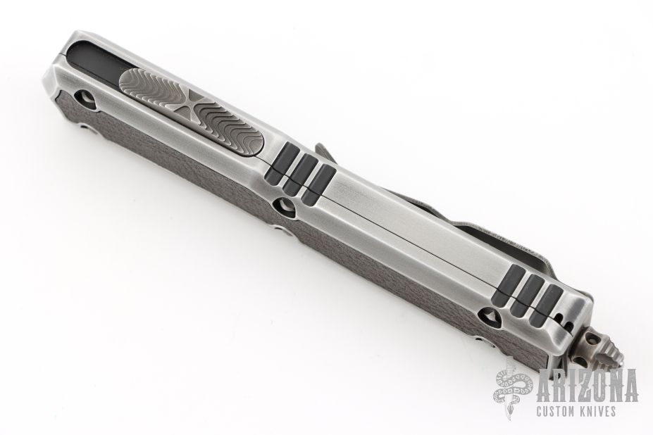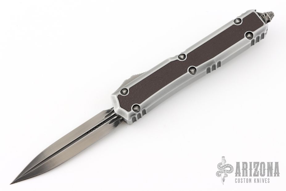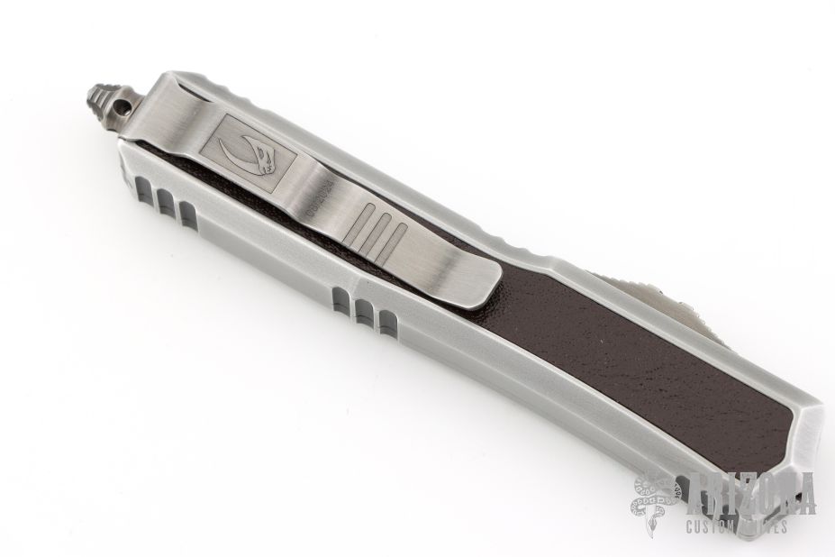 This Makora OTF automatic by Microtech features a distressed double edge blade. The handle has a satin silver/black aluminum frame with leather inlays, stainless steel clip, tip down carry. Dated 08/2024 on clip. Comes with the original box and papers. Excellent Condition.
