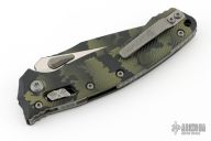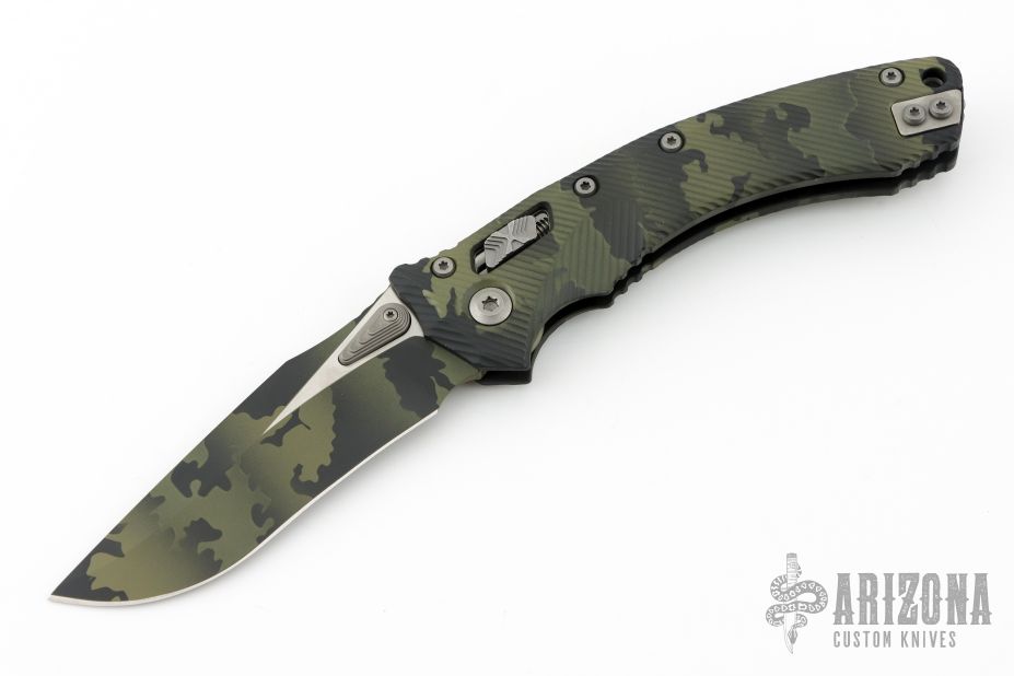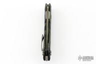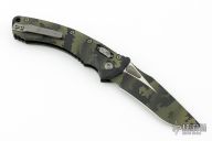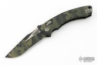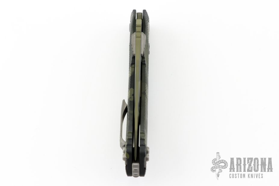 Amphibian folder with Ram-Lok sliding button lock. Fluted Olive Camo finished Aluminum handle- Olive Camo finished plain edge blade.