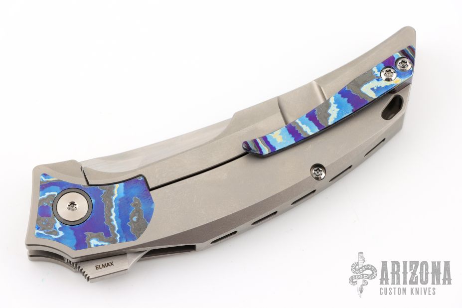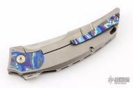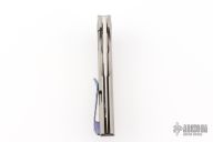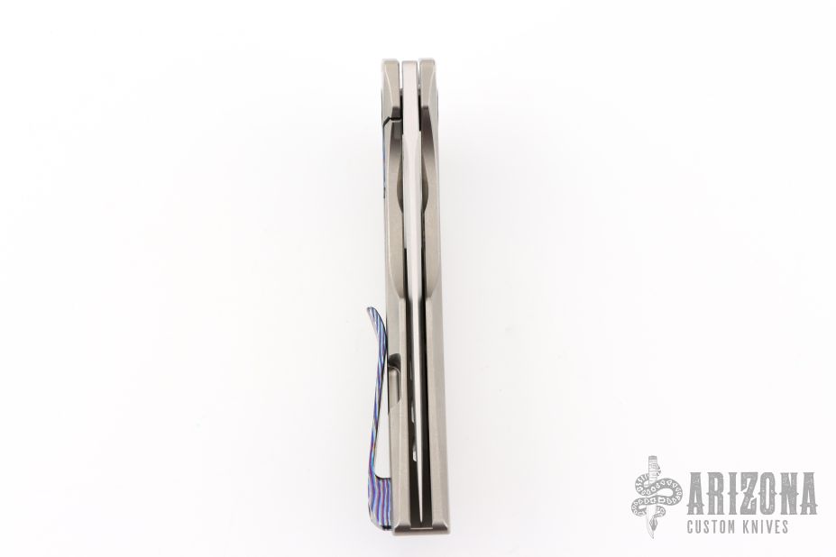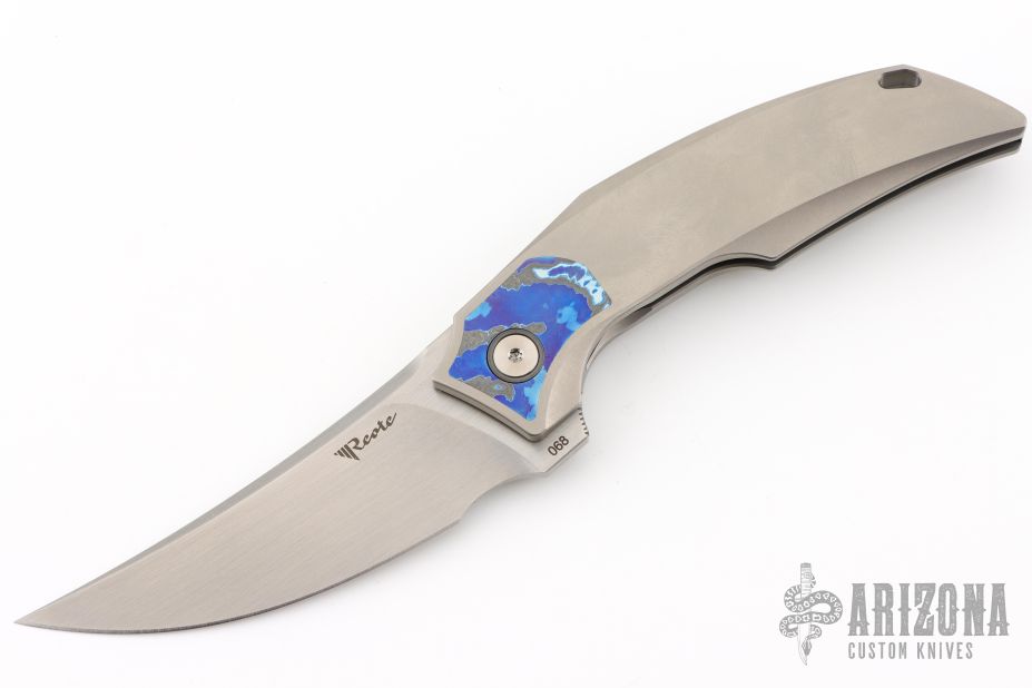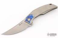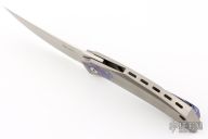 This Velocity by Reate is a Tashi Bharucha design. It features a hand rub satin finished blade with flipper. The handle has a bead blasted titanium frame with Zircuti pivot collars and tip up clip. Rides on bearings, nice detent, lockup and blade seating. Comes with the original box and accessories. Excellent condition. #68