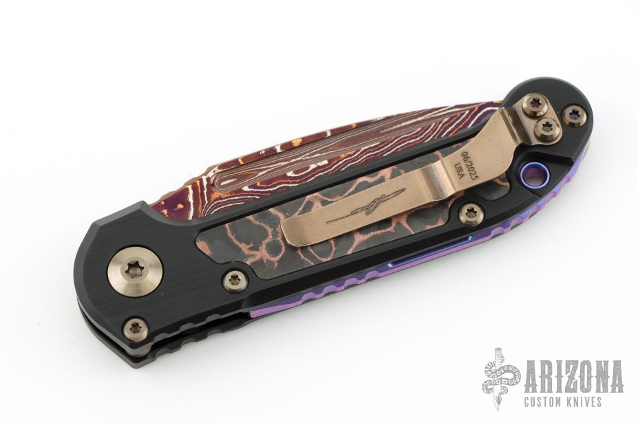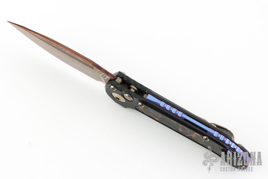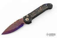 Home Products LUDT Clip Point Marfione Select Blued Baker Forge Coppermai Damascus Hefted Alloy w/ Protech Composites Livewire Carbon Fiber Inlay Bronze Hard Cut Hardware & Purple Haze Titanium Accent