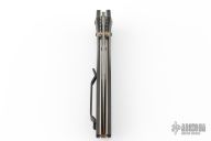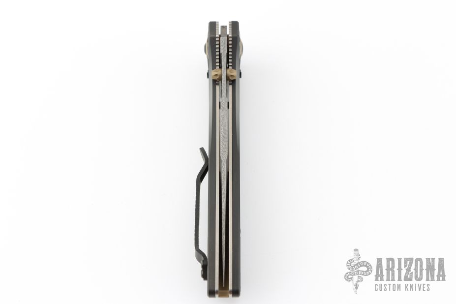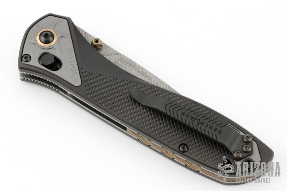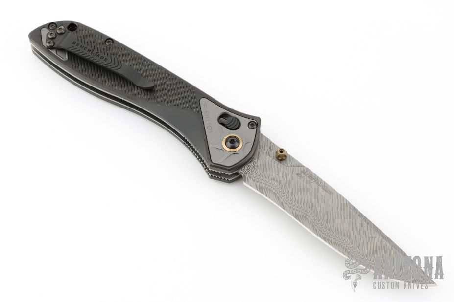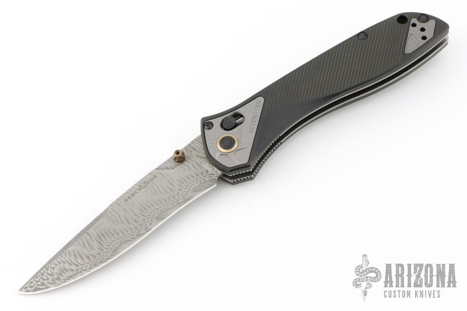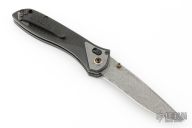 This is a McHenry and Williams designed knife by Benchmade features a Fafnir Damasteel blade with dual FDE thumbstuds. The handle has milled titanium covers, aluminum inlaid bolsters, black finished stainless liners, intricate backstrap, black finished reversible tip up clip. Comes with the original box, papers, COA, drawstring pouch and Gold Class outer box. Excellent condition.