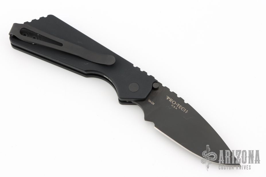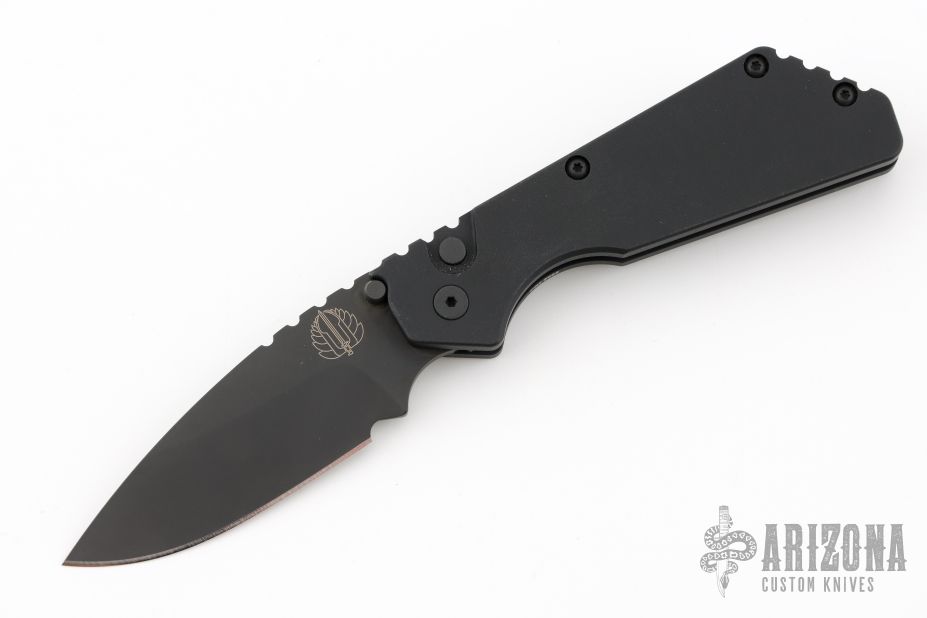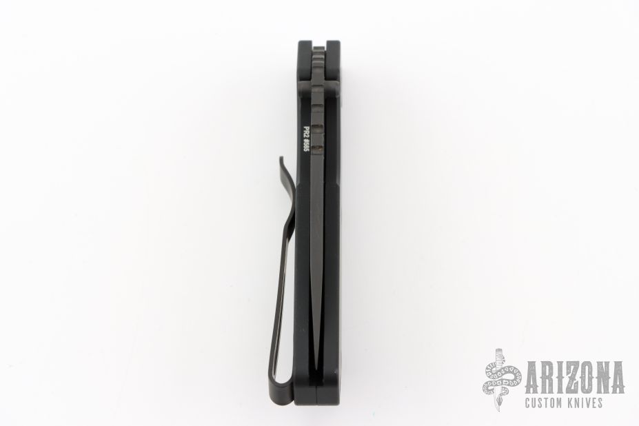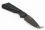 This Pro-Strider PT by Pro-Tech and Strider Knives features a black 154CM blade with notched thumbrest. The handle has a black aluminum frame with black hardware and black stainless steel tip up clip. Comes with original box and papers. Has a few light scuffs and scratches, great condition otherwise.